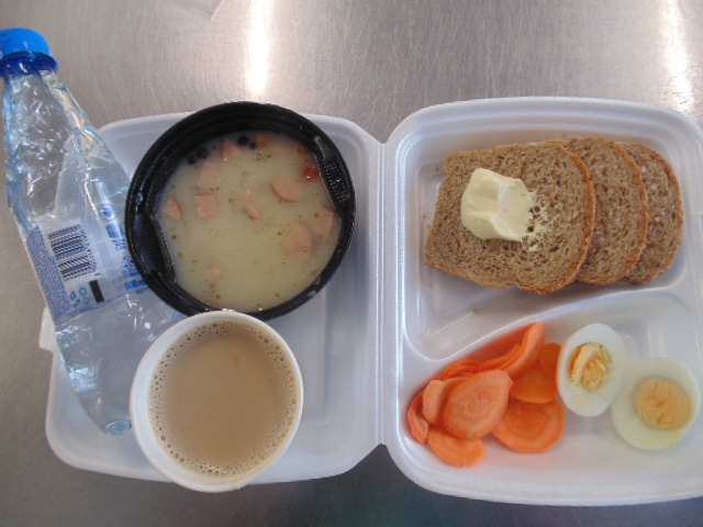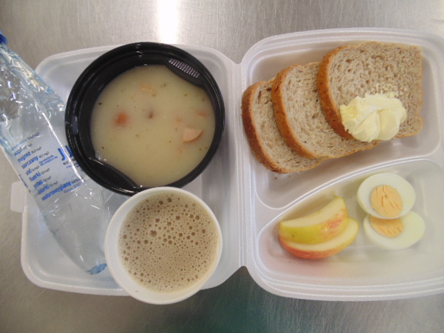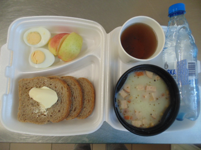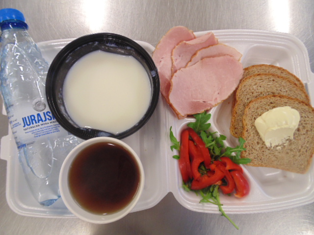 | Chleb graham 50g(gluten), margaryna śniadaniowa 5g (mleko), szynka gotowana 30g (soja, mleko), pomidor | Chleb graham 100g (gluten), margaryna śniadaniowa 15g (mleko), krupnik z mięsem: ziemniaki 100g, kasza jęczmienna 30g (gluten), biodrówka 30g, marchew 30g, pietruszka 20g, seler 20g, śmietana 5g (mleko), kości 10g, przyprawy (seler), herbata 200ml. | Jogurt naturalny 150g (mleko) |