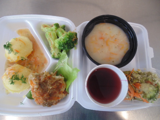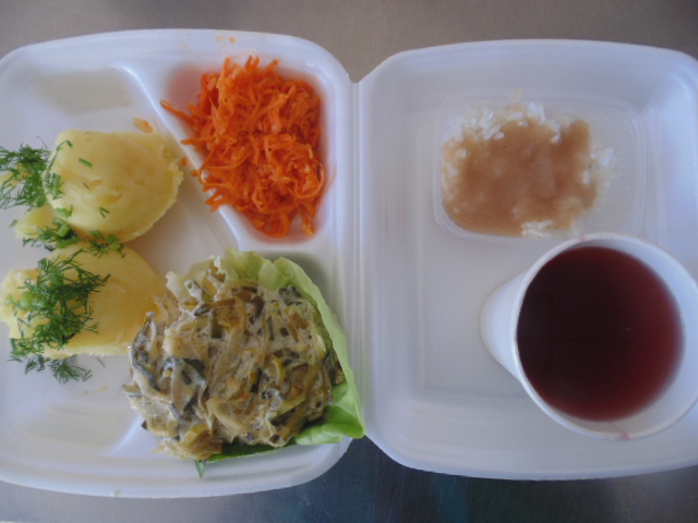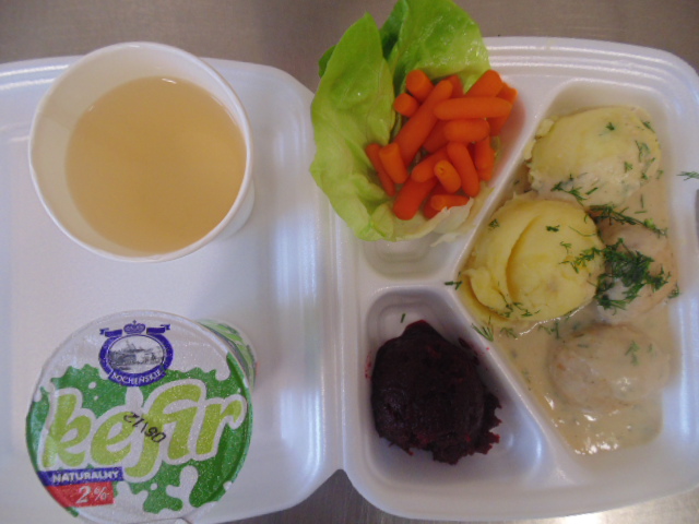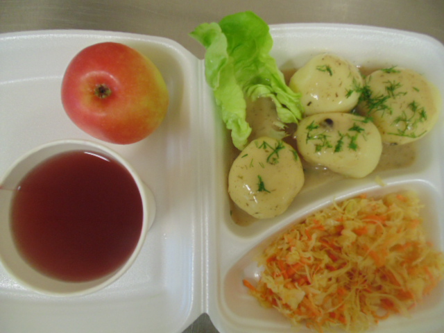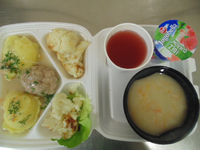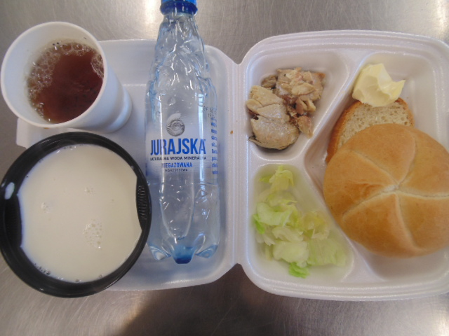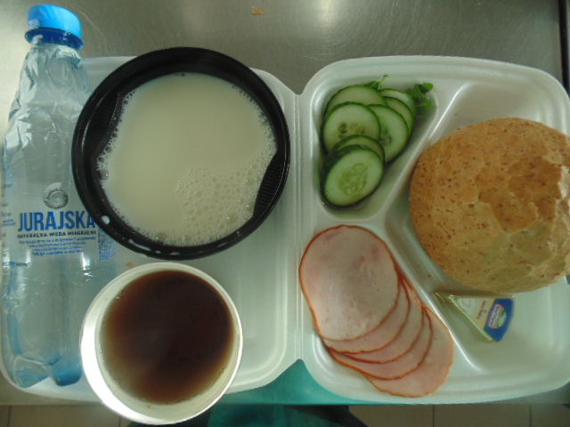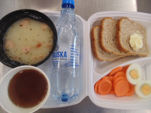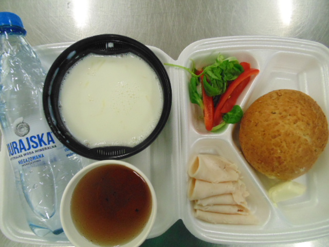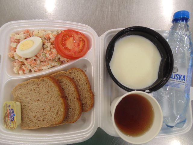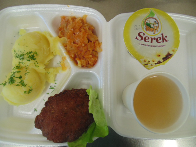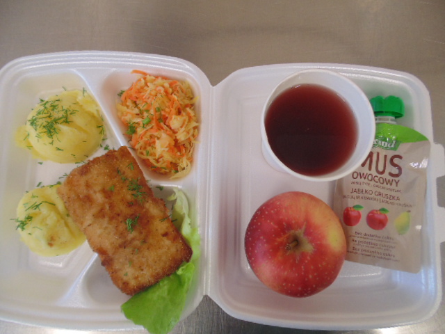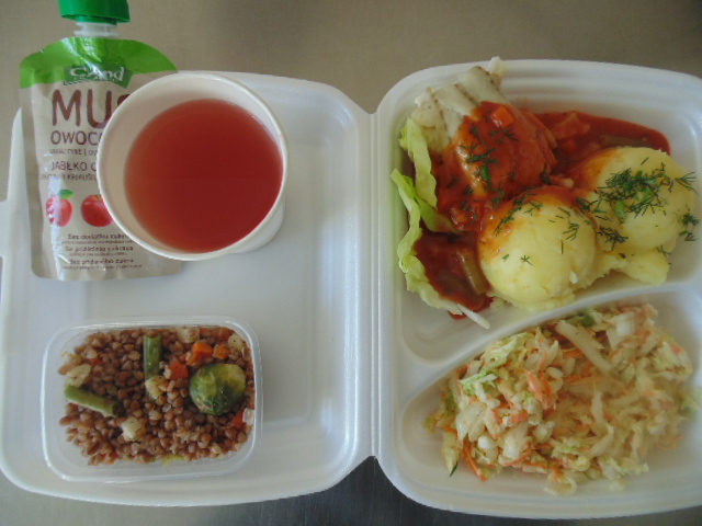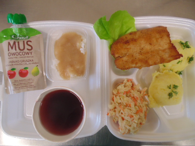 | Rogal 100g (gluten, jaja, mleko), margaryna śniadaniowa 15g (mleko), dżem niskosłodzony 50g, twaróg 40g (mleko), marchew 50g, herbata 200ml, zupa mleczna z kaszą manną 400ml (mleko, gluten) | Ryba panierowana: ryba 100g, bułka tarta 20g (gluten), 20g olej, mleko 5g, mąka pszenna 10g (gluten), jajka 1/5 szt., ziemniaki 350g, surówka z kapusty kiszonej: kapusta kiszona 150g, cebula 30g, marchew 30g, jabłko 30g, olej 5g, przyprawy (seler), kompot z owoców mieszanych 200ml.,mus owocowy 1szt. | Chleb graham 100g (gluten), margaryna śniadaniowa 15g (mleko), pasta z jaj : jajko 1,5 szt, majonez 20 g (gorczyca, jajko), chleb pszenny (gluten) 10g, musztarda (gorczyca), śledzie marynowane (ryba), pomidor 50g, szczypiorek, herbata 200ml. |