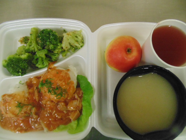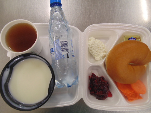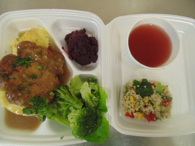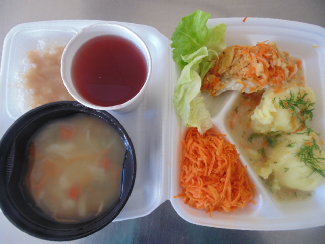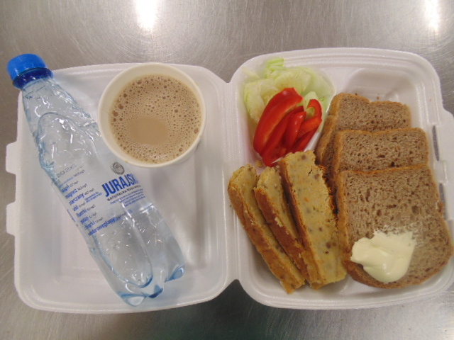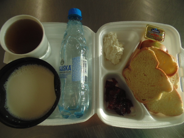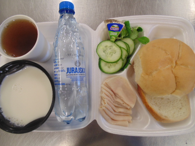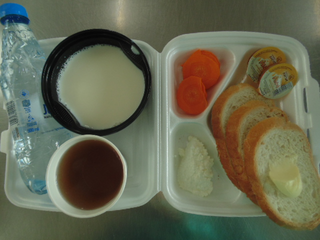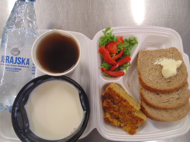 | Chleb graham 50g (gluten), margaryna śniadaniowa 5g (mleko), twaróg 40g (mleko), sałata zielona | Chleb graham 100g (gluten), margaryna śniadaniowa 15g (mleko), galaretka drobiowa: udziec z kurczaka 100g, marchew 20g, pietruszka 10g, seler 10g, żelatyna spożywcza , herbata 200ml. | Sałatka z kaszą jęczmienną: kasza jęczmienna (gluten) 20g, marchewka 30g, brokuł 30g, fasolka szparagowa 30g, olej |
