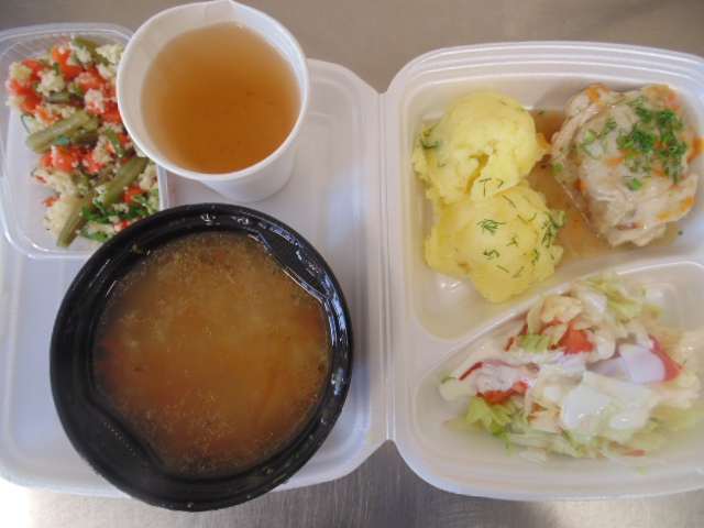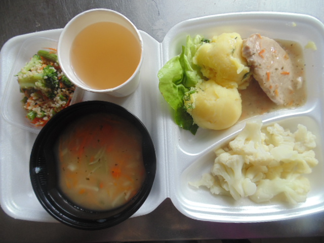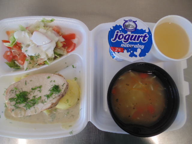 | Chleb graham 100 g (gluten), margaryna śniadaniowa 15g (mleko), klops drobiowy(gulasz z indyka 70g,pieczywo pszenne20g, (gluten), jajko 1/8 szt, maka ziemniaczana, przyprawy (seler)), papryka 50g, rukola, płatki owsiane na mleku 400ml (mleko, gluten), herbata 200ml | Chleb graham 50g (gluten), margaryna śniadaniowa 5g (mleko), szynka gotowana 30g (soja, mleko), pomidor | Rosół z makaronem: makaron 30g (gluten, jajko), marchew 30g, pietruszka 20g, seler 20g, wywar kostny drobiowy, przyprawy (seler), udziec drobiowy w sosie: udziec drobiowy 200g, olej, marchew 30g, pietruszka 20g, seler 20g, śmietana 5g (mleko), mąka pszenna 15g (gluten), przyprawy (seler), ziemniaki 350 g, sałata lodowa, śmietana (mleko) 20g, jogurt naturalny (mleko) 20g, kompot z jabłek 200ml., |