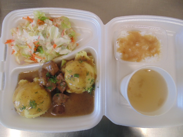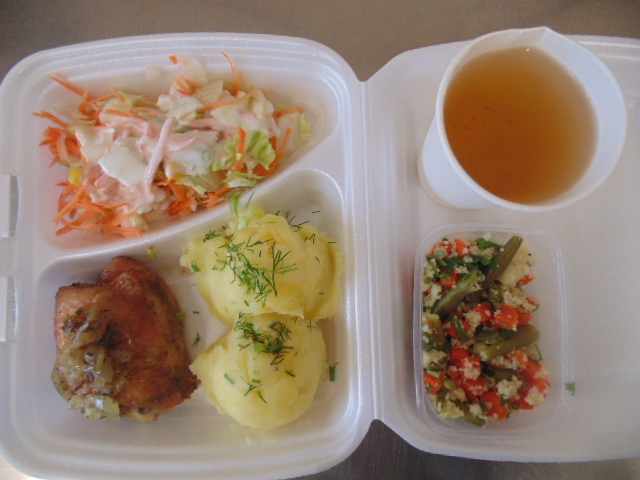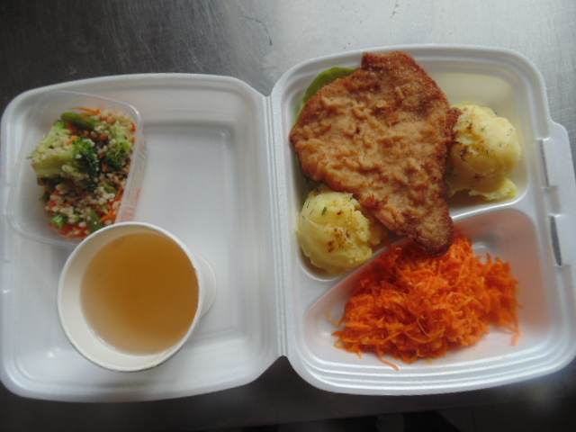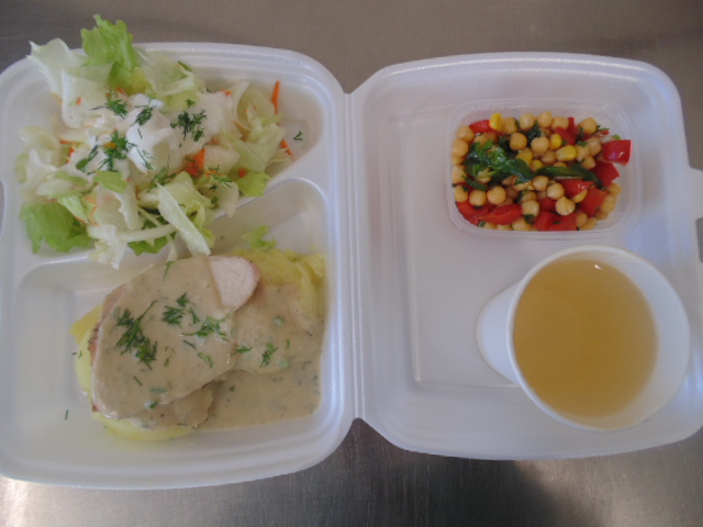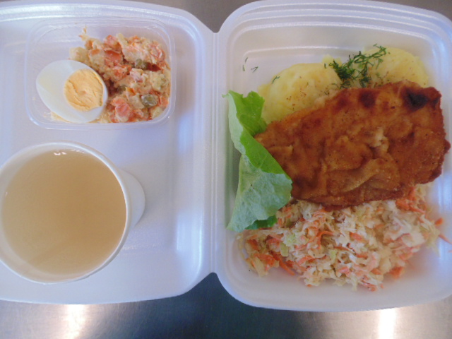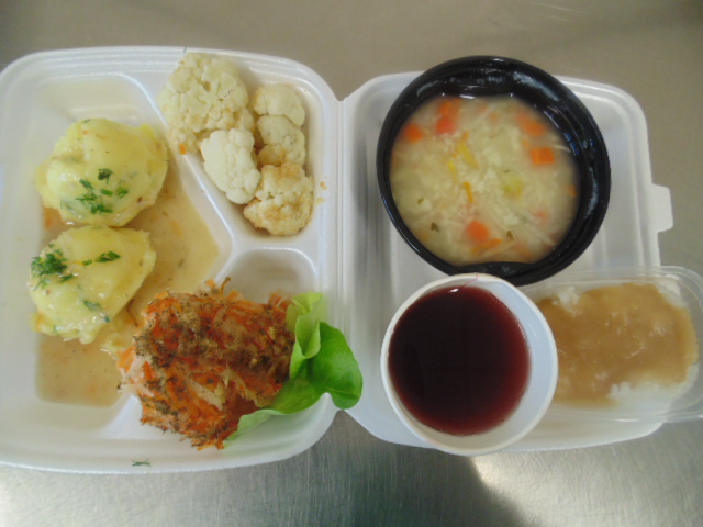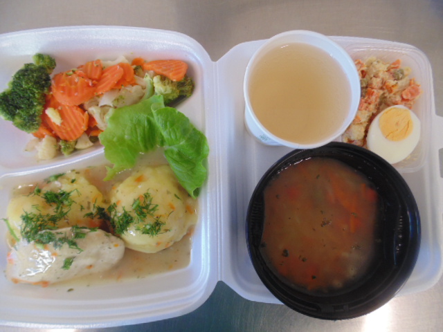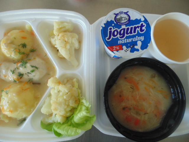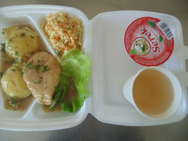 | Pieczywo pszenne 50g (gluten), margaryna śniadaniowa 15g (mleko), szynka wiejska 60g, ogórek zielony 50g, roszponka, mozarella (mleko), kawa zbożowa (mleko, kawa zbożowa (gluten) cukier), woda niegazowana 0,5l | Filet drobiowy soute: filet drobiowy 100g, cebula 30g, mąka pszenna 15g (gluten), śmietana 5g (mleko), olej 15g, przyprawy (seler), ziemniaki 350g, surówka z kapusty włoskiej (150g kapusta włoska, 30g marchew, 30g cebula, 30g jabłko, 20g pomidor, majonez (gorczyca, jajko), przyprawy: sól, cukier, pieprz, musztarda (gorczyca)), kompot z jabłek 200ml. | Chleb graham 100g (gluten), margaryna śniadaniowa 15g (mleko), krupnik z mięsem: ziemniaki 100g, kasza jęczmienna 30g (gluten), biodrówka 30g, marchew 30g, pietruszka 20g, seler 20g, śmietana 5g (mleko), kości 10g, przyprawy (seler), herbata 200ml. |