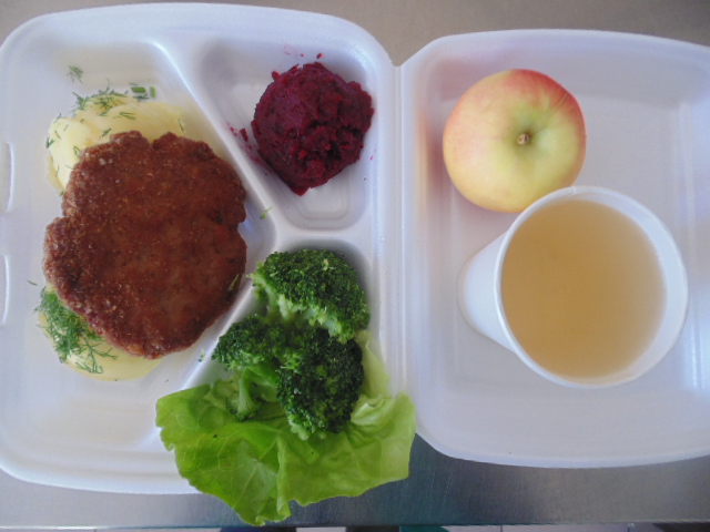 | Bułka grahamka(gluten), serek topiony(mleko), kiełbasa krakowska (soja) 60g, ogórek zielony 50g, rukola, zupa mleczna z ryżem 400 ml (mleko), herbata 200 ml, woda niegazowana 0,5l | Kotlet mielony: biodrówka 50g, wołowina 50g, cebula 30g, pieczywo pszenne 20g (gluten), jajka 1/5 szt., mąka pszenna 10g (gluten), mąka ziemniaczana 5g, olej 20g, ziemniaki 350g, ćwikła: buraki czerwone 180g, chrzan 5g (mleko), brokuł na parze (brokuł 100g), przyprawy (seler), kompot z jabłek 200ml. | Pieczywo pszenne 100g (gluten), margaryna śniadaniowa 15g (mleko), pasta z jajek: jajka 1 i ½ szt., majonez 20g (gorczyca, jajko), pieczywo pszenne 10g (gluten), musztarda (gorczyca), szczypiorek,sałata lodowa, herbata 200ml. |