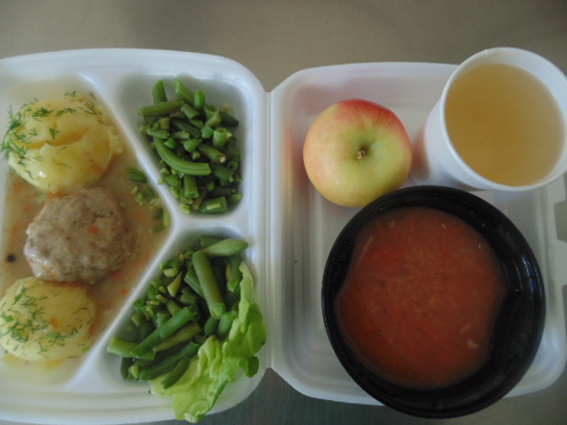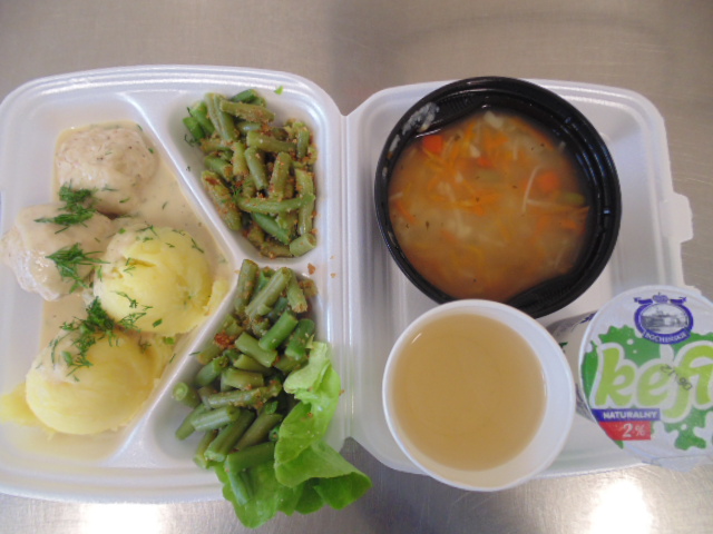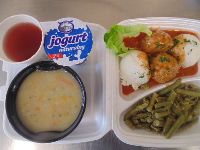 | Chleb graham 100g (gluten), margaryna śniadaniowa 15g (mleko), żurek z jajkiem i kiełbasą 400ml : kości 10g, jajko 1 szt, kiełbasa toruńska 50g (soja), słonina, mąka pszenna20g (gluten), śmietana 10g (mleko), przyprawy (seler), marchew 50g, herbata 200ml, woda niegazowana 0,5l. | Chleb graham 50g (gluten), margaryna śniadaniowa 5g, twaróg 40g (mleko), sałata lodowa | Zupa ziemniaczana : ziemniaki 250g, marchew 30g, seler 20g, pietruszka 20g, śmietana 20g (mleko), wywar kostny, przyprawy (seler), pulpeciki w sosie pomidorowym: biodrówka 50g, wołowina b/k 50g, cebula 30g, pieczywo pszenne 20g (gluten), jajka 1/8, mąka pszenna 15g (gluten), koncentrat pomidorowy 15g, olej 15g, mąka ziemniaczana 5g, przyprawy (seler), ryż 80g, fasolka na parze :fasolka szparagowa 150g, masło ekstra ( mleko), bułka tarta 5g (gluten), kompot z owoców mieszanych 200 ml. |