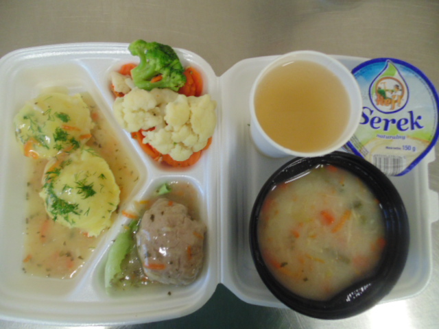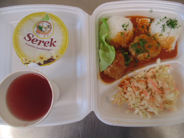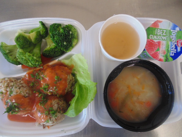 | Chleb graham 100g (gluten), margaryna śniadaniowa 15g (mleko), żurek z jajkiem i kiełbasą 400 ml: kości 10g, jajko 1 szt, kiełbasa toruńska 50g (soja), słonina , mąka pszenna 20g (gluten), śmietana 10g (mleko), przyprawy (seler), marchew 50g, herbata 200ml, woda niegazowana 0,5l. | Pulpeciki w sosie pomidorowym: biodrówka 50g, wołowina b/k 50g, cebula 30g, pieczywo pszenne 20g (gluten), jajka 1/8, mąka pszenna 15g (gluten), konc. pomidorowy 15g, olej 15g, mąka ziemniaczana 5g, przyprawy (seler), ryż 80g, surówka z kapusty białej : kapusta biała 150g, marchew 30g, cebula 30g, jabłko 30g, majonez 20g (gorczyca, jajko), przyprawy (gorczyca), kompot z owoców mieszanych 200 ml. | Chleb pszenny 100g (gluten) margaryna śniadaniowa 15g (mleko), baleron 60g (soja, gluten), sałata zielona, papryka 50g, kawa zbożowa z mlekiem 200 ml (mleko, gluten). |