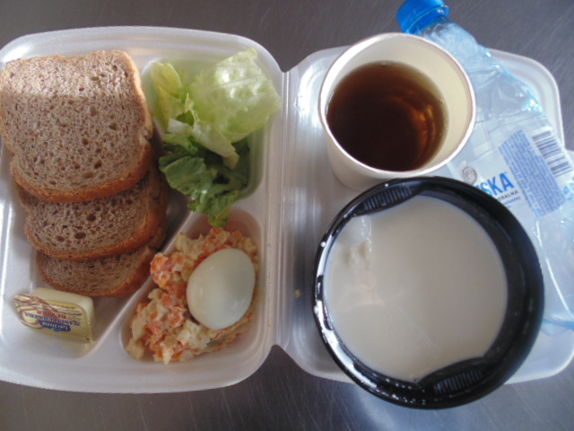 | Chleb graham 50g (gluten), margaryna śniadaniowa 5g (mleko), jajko 1/2szt., sałata lodowa | Chleb graham 100g (gluten), margaryna śniadaniowa 15g (mleko), twaróg 80g (mleko), pomidor 50g, herbata 200ml. | Sałatka z kaszą jęczmienną: kasza jęczmienna 20g (gluten), brokuł 30g, fasolka szparagowa 30g, olej, marchew 30g, przyprawy |