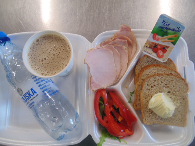 | Chleb graham 50g (gluten), margaryna śniadaniowa 5g(mleko), polędwica sopocka 30g, sałata zielona | Chleb graham 100g (gluten), margaryna śniadaniowa 15g (mleko), twarożek 80g (mleko), pomidor 50g, herbata 200ml. | Sałatka z kaszą gryczaną: kasza gryczana 20g, bukiet warzyw 40g, olej, rukola, przyprawy. |