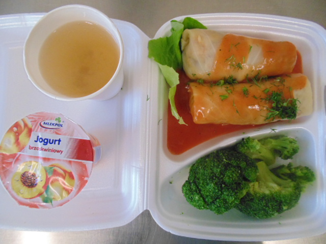 | Chleb pszenny 30g (gluten), kajzerka (gluten) serek topiony (mleko), polędwica z indyka 60g (soja, gluten, gorczyca), ogórek 50g, roszponka, zupa mleczna z płatkami owsianymi 400ml (mleko, gluten), herbata 200ml, woda niegazowana 0,5l | Gołąbki w sosie pomidorowym: kapusta biała 350g, ryż 80g, biodrówka 50g, wołowina 50g, koncentrat pomidorowy 30g, mąka pszenna 30g (gluten), słonina, cebula 30g, śmietana 5g (mleko), olej, przyprawy (seler), brokuł na parze : brokuł 150g, kompot z jabłek 200ml. | Chleb graham 100g (gluten), margaryna śniadaniowa 15g (mleko), ser żółty 60g (mleko), sałata lodowa, herbata 200ml. |