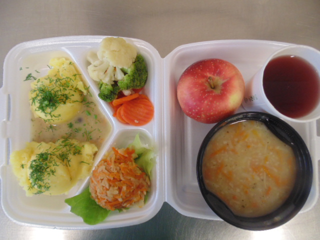 | Posiłek dodatkowy: Sałatka jarzynowa: marchew, ziemniaki, pietruszka, seler, jabłko, groszek konserwowy, jajko ½ szt, majonez (gorczyca, jajko), jogurt naturalny (mleko), chleb graham (gluten) 30g | Wartość energetyczna [kcal] 2322,9 Wartość odżywcza: Białko [g] 92,5 Tłuszcz [g] 87,2 Kwasy tłuszczowe nasycone [g] 17,7 Węglowodany ogółem [g] 308,9 w tym cukry [g] 55,1 Błonnik pokarmowy [g] 32,05 Sól [g] 6,08 | Wykaz alergenów zgodnie z ROZPORZĄDZENIEM PARLAMENTU EUROPEJSKIEGO I RADY (UE) NR 1169/2011 Z DNIA 25 PAŹDZIERNIKA 2011 r.:1. zboża zawierające gluten, 2. skorupiaki, 3. jaja, 4. ryby, 5. orzeszki ziemne, 6. ziarno sojowe, 7. mleko, 8. orzechy z drzew orzechowych, 9. seler, 10. gorczyca, 11. ziarno sezamowe, 12. dwutlenek siarki oraz siarczyny, 13. łubiny, 14. mięczaki |