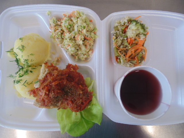 | Rogal (gluten, mleko, jajka), masło ekstra (mleko), dżem niskosłodzony 50g, marchew 50g, zupa mleczna z kaszą manną 300ml (mleko, gluten), herbata 200ml. | Ryba panierowana: ryba 100g, bułka tarta 20g (gluten), 20g olej, mleko 5g, mąka pszenna 10g (gluten), jajka 1/5 szt., ziemniaki 350g, surówka z kapusty białej: kapusta biała 150g, cebula 30g, marchew 30g, jabłko 30g, majonez 20g (gorczyca ,jajko), sałata zielona, przyprawy (seler), kompot z owoców mieszanych 200ml., mus owocowy 1szt | Chleb graham 100g (gluten), margaryna śniadaniowa 15 g (mleko), twarożek 80g (mleko), rzodkiewka, szczypiorek, herbata 200ml. |