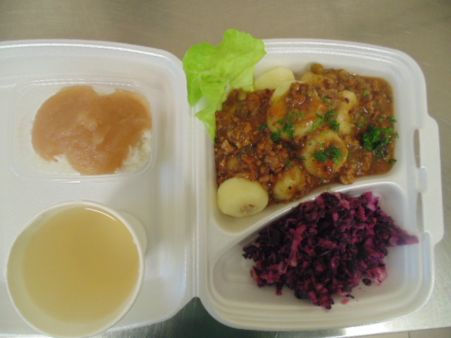 | Chleb graham100g (gluten), margaryna śniadaniowa 15g (mleko), pasztet z soczewicy: soczewica 40g, marchew 20g, pietruszka 15g, cebula 10g, ryż 15g, jajko 1/6 szt, mąka ziemniaczana 6g, bułka tarta 5g (gluten), olej, papryka 50g, sałata zielona, przyprawy (seler), kawa zbożowa z mlekiem 200 ml (gluten, mleko) | Kluski śląskie z sosem mięsno- jarzynowym: ziemniaki 350g, mąka ziemniaczana 50g, olej 5g, słonina 10g , jajko 1/5szt , biodrówka 50g, wołowina b/k 50g, mąka pszenna 15g (gluten), cebula 30g, marchew 30g, pietruszka 20g, seler 20g, olej 5g, ogórek konserwowy 10g, groszek konserwowy 10g, śmietana 5g (mleko), przyprawy (seler), surówka z kapusty czerwonej: kapusta czerwona 150g, marchew, cebula 30g, jabłko 30g, olej 5g, przyprawy, kompot z jabłek 200ml. | Pieczywo pszenne 100g (gluten), margaryna śniadaniowa 15g (mleko), zupa ziemniaczana z mięsem: ziemniaki 250g, biodrówka 30g, marchew 30g, pietruszka 20g, seler 20g, śmietana 10g (mleko), kości 10g, przyprawy (seler), herbata 200ml. |