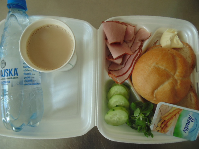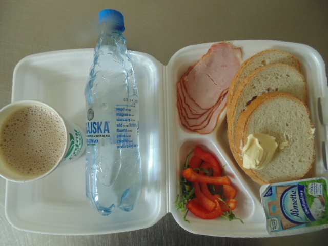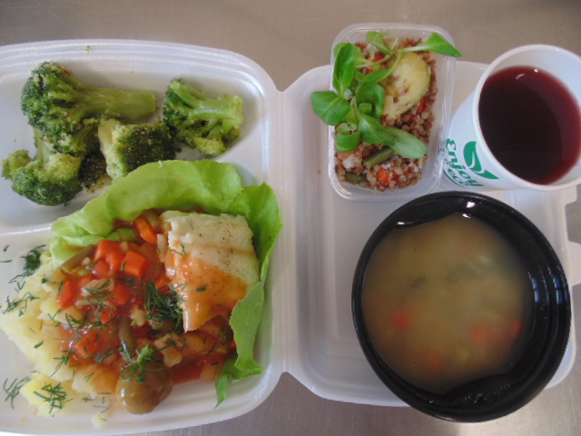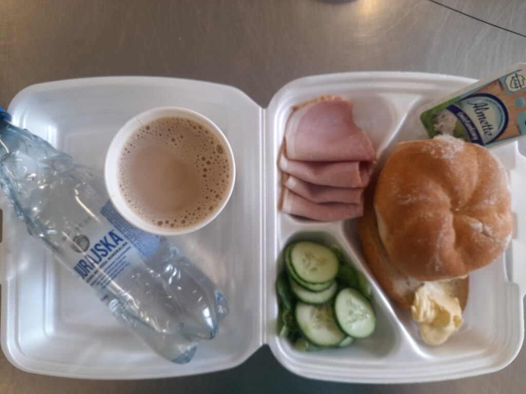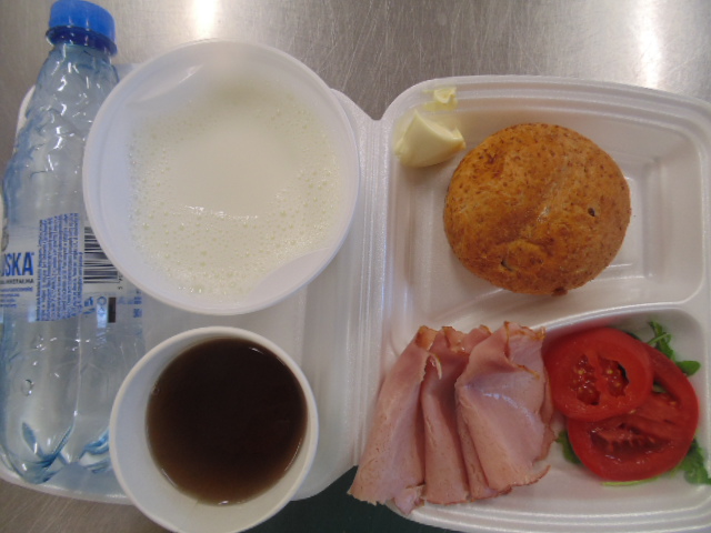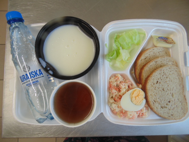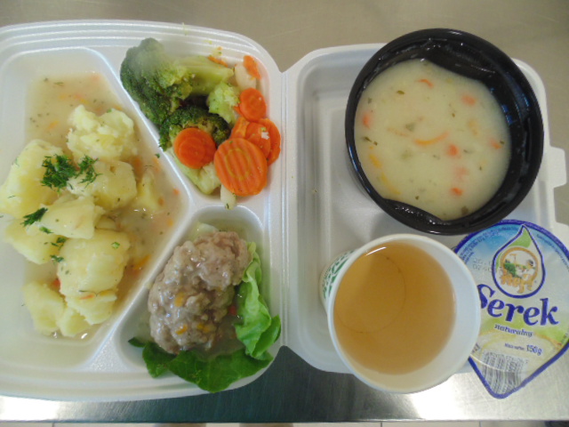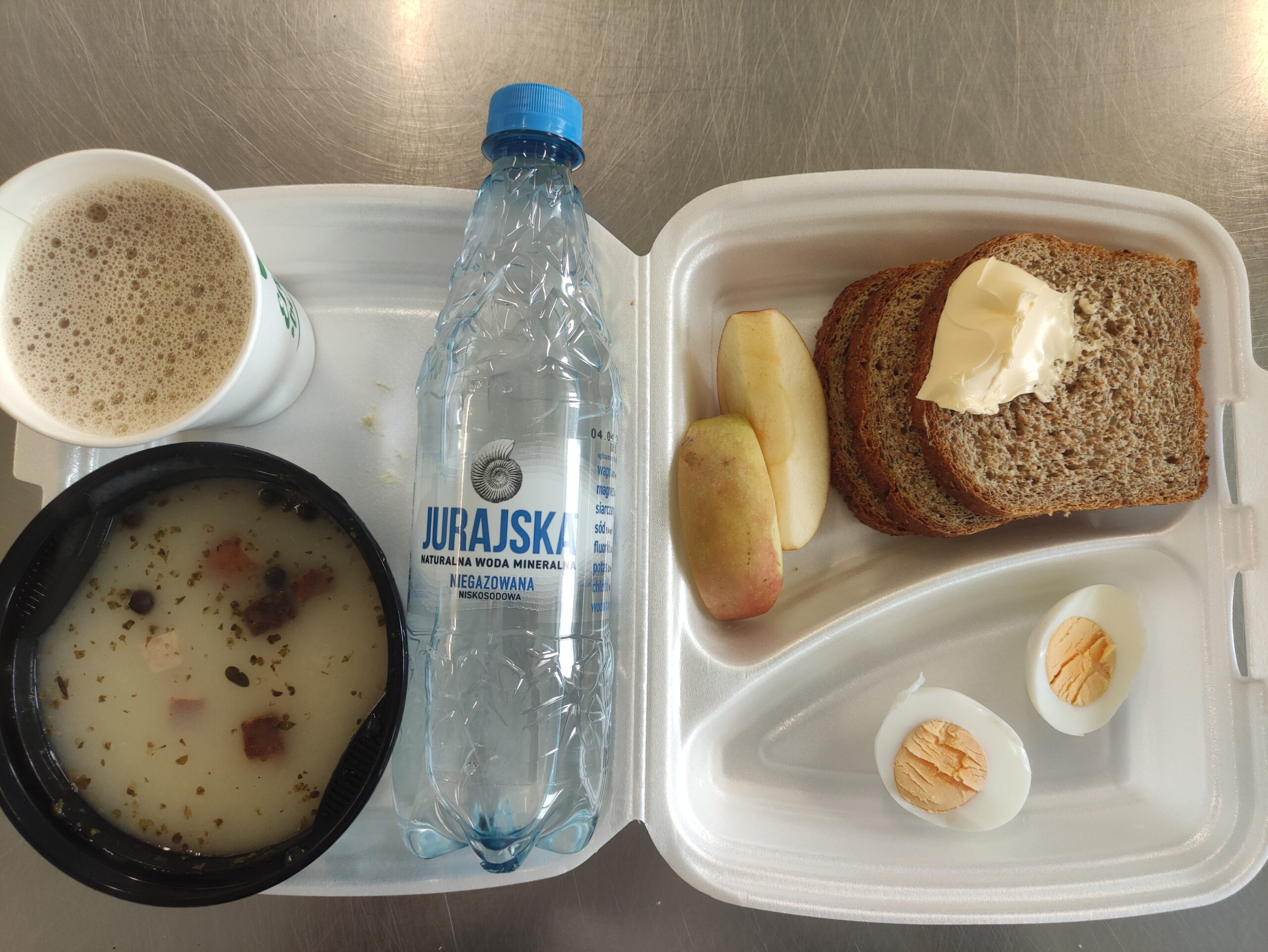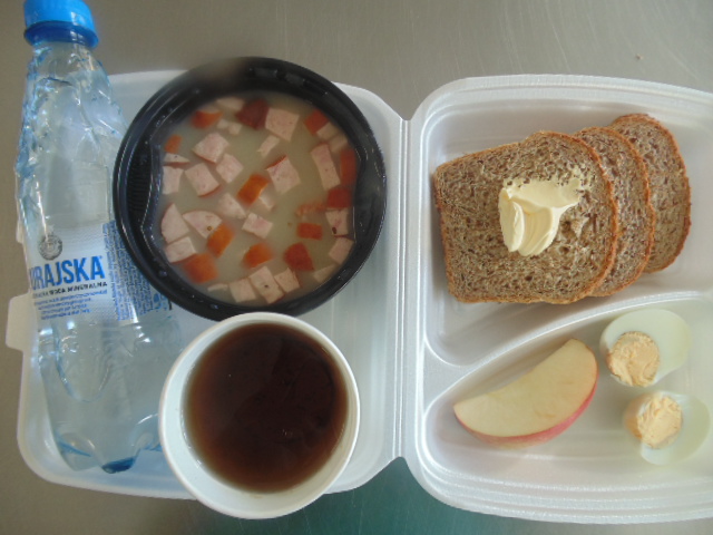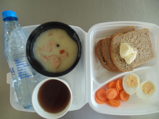 | Pieczywo pszenne 50g (gluten), bułka kajzerka 50g (gluten), margaryna śniadaniowa 15g (mleko), szynka wiejska 60g, ogórek zielony 50g, roszponka, serek śmietankowy (mleko) 30g, kawa zbożowa z mlekiem 200ml (mleko, gluten), woda niegazowana 0,5l | Filet drobiowy soute: filet drobiowy 100g, cebula 30g, mąka pszenna 15g (gluten), śmietana 5g (mleko), olej 15g, przyprawy (seler), ziemniaki 350g, surówka z kapusty włoskiej (150g kapusta włoska, 30g marchew, 30g cebula, 30g jabłko, 20g pomidor, majonez (gorczyca, jajko), przyprawy: sól, cukier, pieprz, musztarda (gorczyca)), kompot z jabłek 200ml | Chleb graham 100g (gluten), margaryna śniadaniowa 15g (mleko), krupnik z mięsem: ziemniaki 100g, kasza jęczmienna 30g (gluten), biodrówka 30g, marchew 30g, pietruszka 20g, seler 20g, śmietana 5g (mleko), kości 10g, przyprawy (seler), herbata 200ml. |