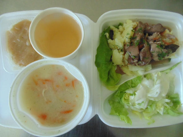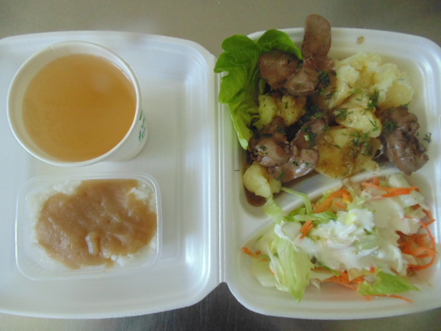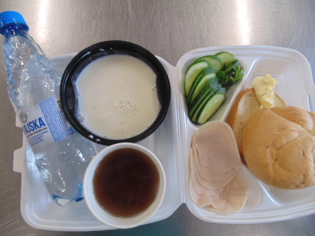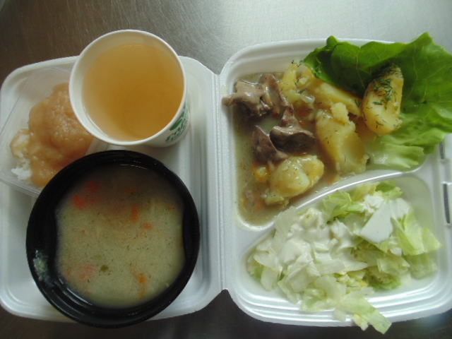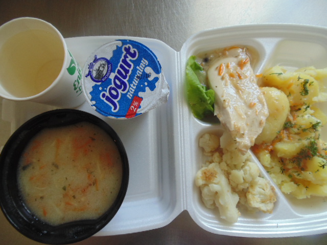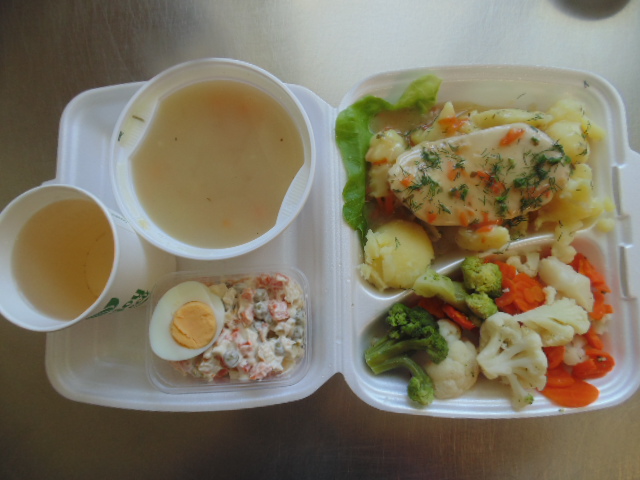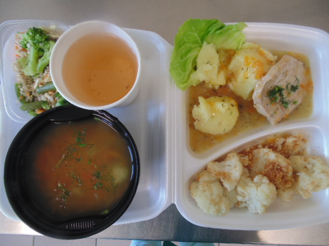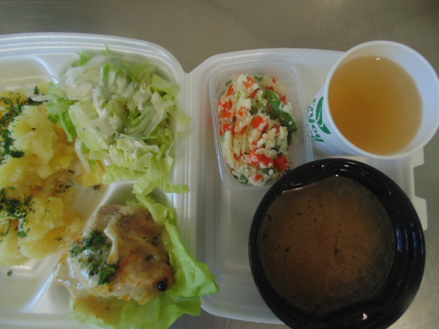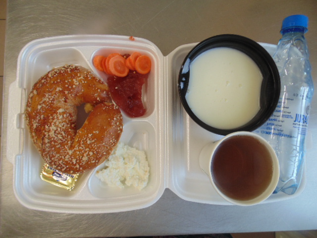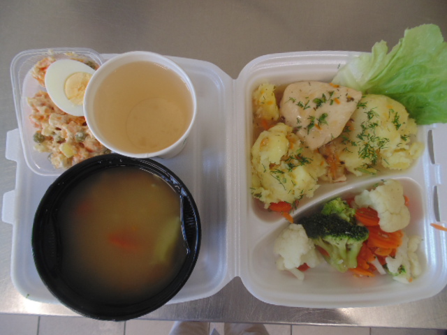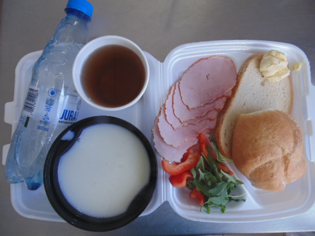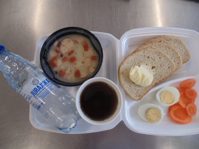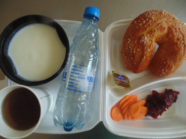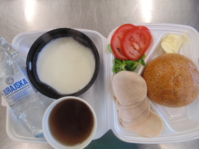 | Pieczywo pszenne 50g (gluten), bułka kajzerka 50g (gluten), margaryna śniadaniowa 15g (mleko), szynka wiejska 60g, ogórek zielony 50g, roszponka, serek śmietankowy (mleko) 30g, kawa zbożowa z mlekiem 200ml (mleko, gluten), woda niegazowana 0,5l | Filet drobiowy soute: filet drobiowy 100g, cebula 30g, mąka pszenna 15g (gluten), śmietana 5g (mleko), olej 15g, przyprawy (seler), ziemniaki 350g, surówka z kapusty włoskiej (150g kapusta włoska, 30g marchew, 30g cebula, 30g jabłko, 20g pomidor, majonez (gorczyca, jajko), przyprawy: sól, cukier, pieprz, musztarda (gorczyca)), kompot z jabłek 200ml | Chleb graham 100g (gluten), margaryna śniadaniowa 15g (mleko), krupnik z mięsem: ziemniaki 100g, kasza jęczmienna 30g (gluten), biodrówka 30g, marchew 30g, pietruszka 20g, seler 20g, śmietana 5g (mleko), kości 10g, przyprawy (seler), herbata 200ml. |
