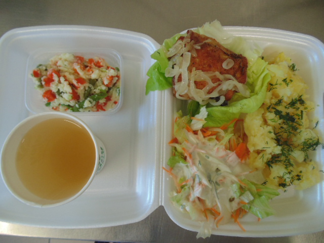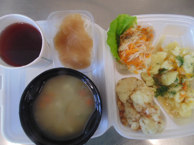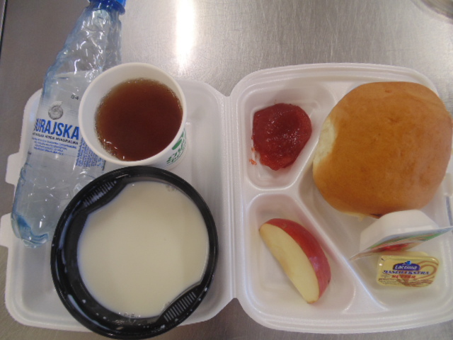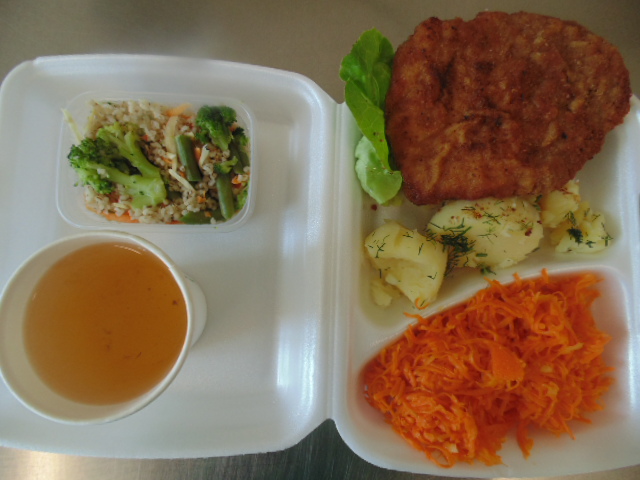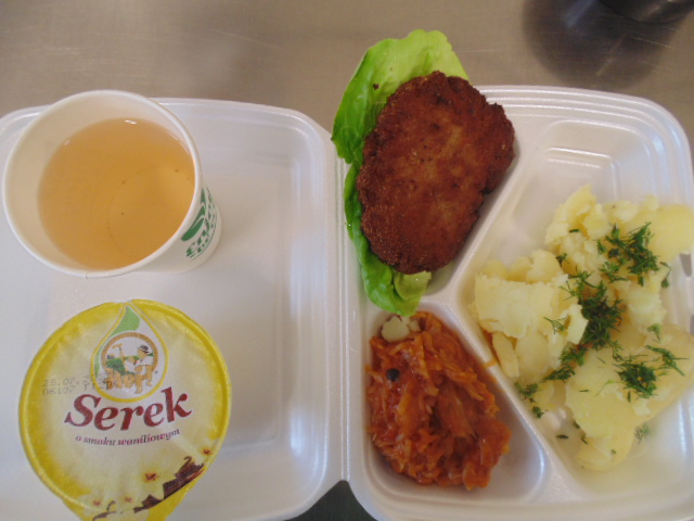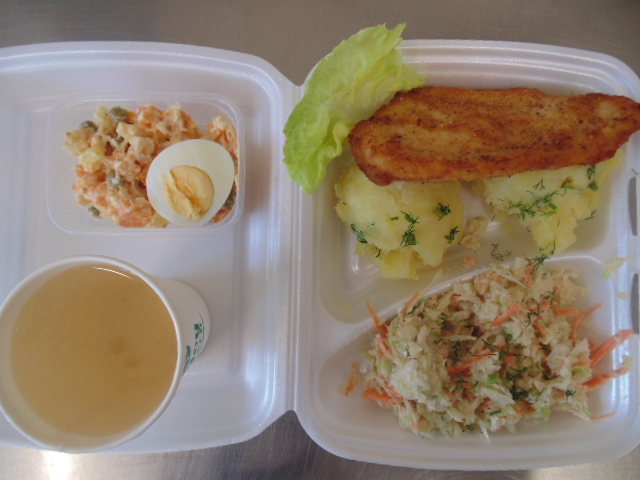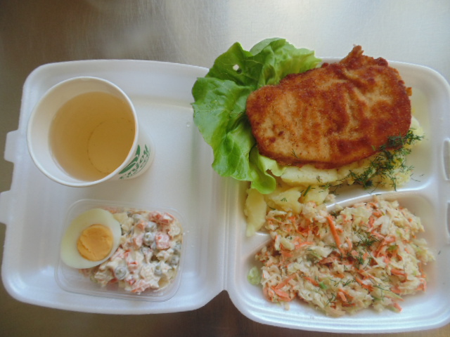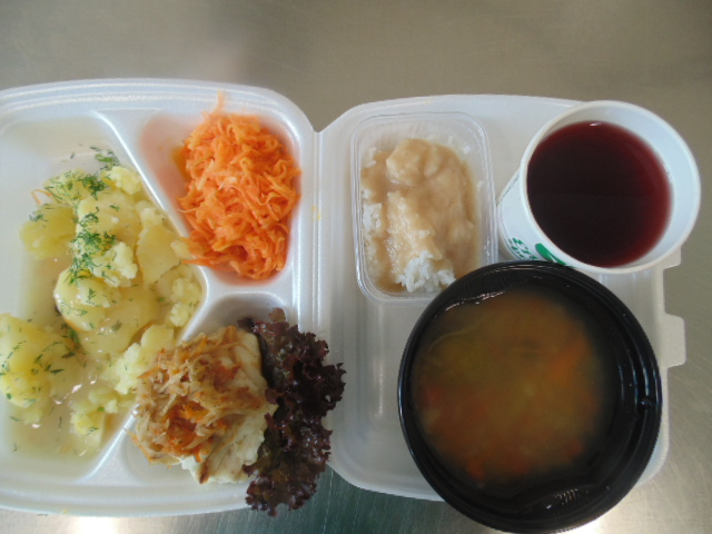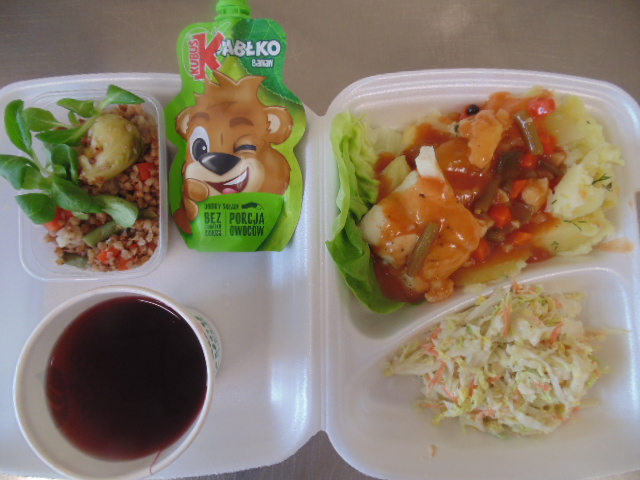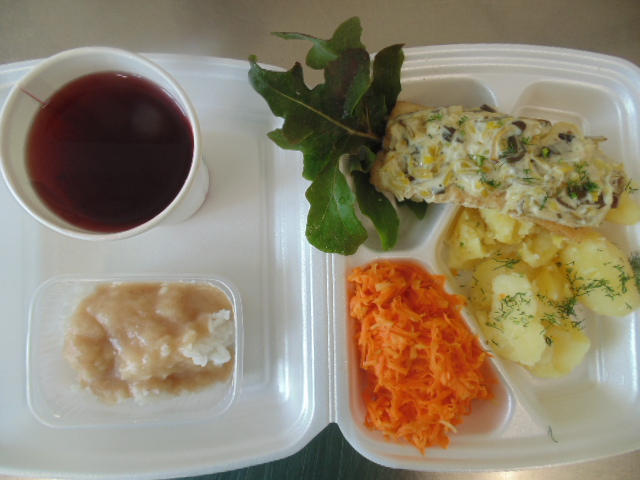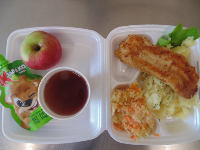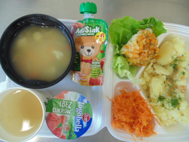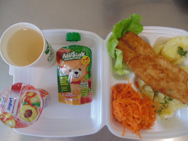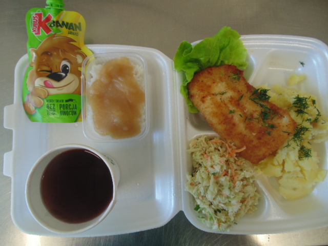 | Rogal (gluten, mleko , jajka), masło ekstra (mleko), dżem wiśniowy niskosłodzony 50g, marchew 50g, zupa mleczna z kaszą manną 300ml (mleko, gluten), herbata 200ml. | Ryba panierowana: ryba 100g, bułka tarta 20g (gluten), 20g olej, mleko 5g, mąka pszenna 10g (gluten), jajka 1/5 szt., ziemniaki 350g, surówka z kapusty białej: kapusta biała 150g, cebula 30g, marchew 30g, jabłko 30g, majonez 20g (gorczyca ,jajko), sałata zielona, przyprawy (seler), mus owocowy 1szt., kompot z owoców mieszanych 200ml., mus owocowy 1szt | Chleb graham 100g (gluten), margaryna śniadaniowa 15 g (mleko), twarożek 80g (mleko), rzodkiewka, szczypiorek, herbata 200ml. |