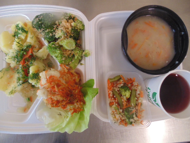 | Chleb graham 100g (gluten), masło ekstra 10g (mleko), sałatka jarzynowa: marchew 100g, ziemniaki 50g, seler 30g, pietruszka 40g, majonez 20g (jaja, gorczyca), śmietana (mleko) 10g, jajko ½ szt, sałata lodowa, zupa mleczna z kaszą manną 400ml (mleko, gluten), herbata 200ml. | Chleb graham 50g (gluten), margaryna śniadaniowa 5g (mleko), pomidor 50g. | Zupa jarzynowa z lanym ciastem: mąka pszenna (gluten), jajka (1/3 szt), mleko, ,marchew 30g, pietruszka 20g, seler 20g, bukiet jarzyn mrożonych (seler) 40g, śmietana (mleko), wywar kostny, przyprawy (seler), ryba duszona w jarzynach: ryba 100g, marchew 70g, pietruszka 50g, seler 50g, olej, przyprawy (seler), ziemniaki 350g, kalafior na parze: kalafior 150g ,bułka tarta (gluten), masło (mleko), kompot z owoców mieszanych 200ml. |
