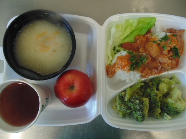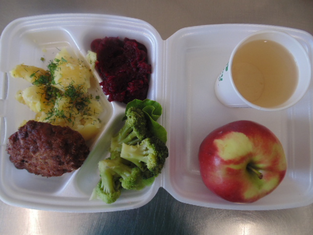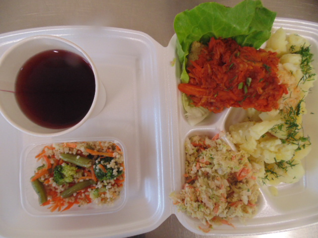 | Chleb graham 50g (gluten), margaryna śniadaniowa 5g (mleko), pomidor 50g. | Chleb graham 100g (gluten), margaryna śniadaniowa 15g (mleko), sałatka jarzynowa: marchew 100g, ziemniaki 30g, pietruszka 40g, seler 30g,jabłko 30g , groszek konserwowy, majonez 20g (jaja, gorczyca), jajko , jogurt naturalny 10g (mleko) przyprawy, herbata 200ml. | Ryż z jabłkami (jabłka, ryż, cynamon). |