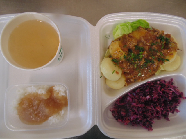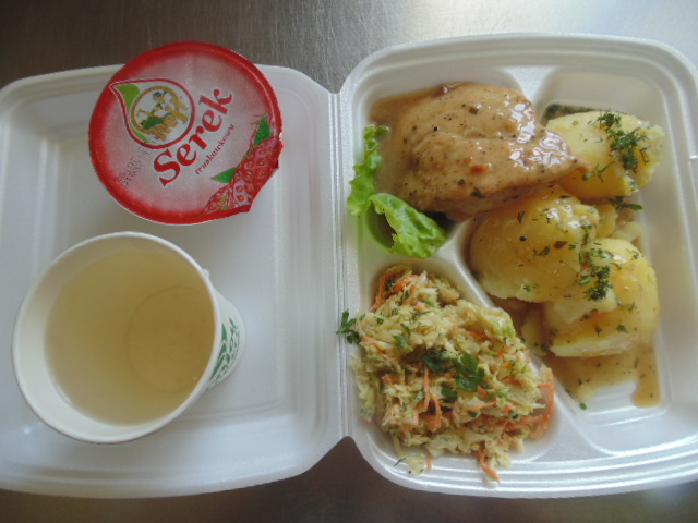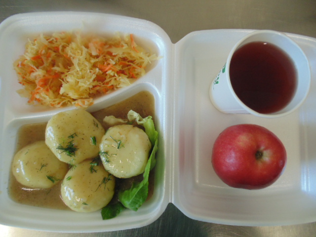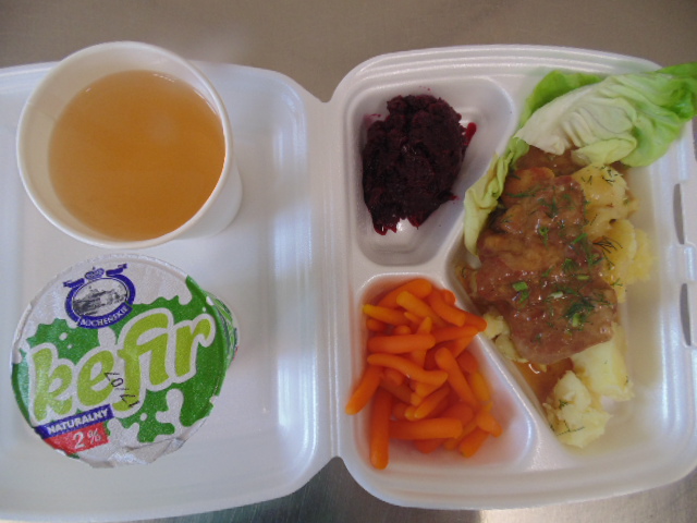 | Pieczywo pszenne 100g (gluten), margaryna śniadaniowa 15g (mleko), żurek z jajkiem i kiełbasą: kości, jajko 1szt, kiełbasa toruńska 50g (soja), słonina 10g, mąka pszenna 20g (gluten), śmietana 10g (mleko), czosnek, przyprawy (seler), jabłko, herbata 200m | Pyzy z mięsem: ziemniaki 350g, biodrówka 70g, mąka pszenna 40g (gluten), mąka ziemniaczana 50g, jajka 1/5 szt, cebula 30g, słonina 10g, olej 10g, sos pieczeniowy (gluten, soja), surówka z kapusty kiszonej: kapusta kiszona 150g, marchew 30g, cebula 30g, jabłko 30g, olej 5g, przyprawy (seler), kompot z mieszanki owocowej 200ml. | Chleb graham 100g (gluten), margaryna śniadaniowa 15g (mleko), szynka wiejska 60g, pomidor 50g, kawa zbożowa z mlekiem (mleko, gluten) 200ml. |