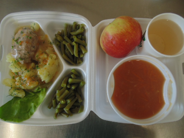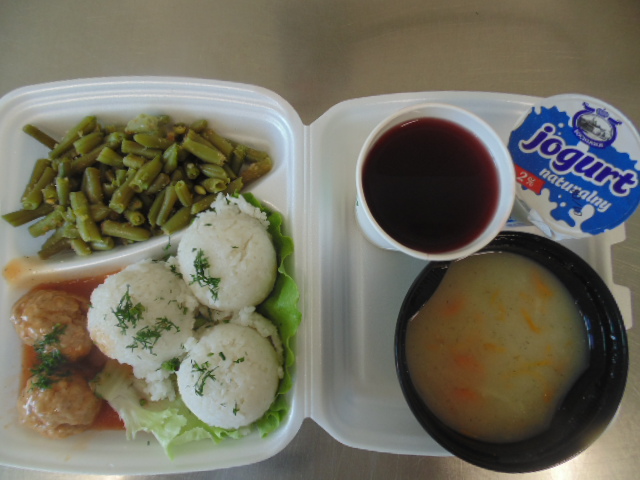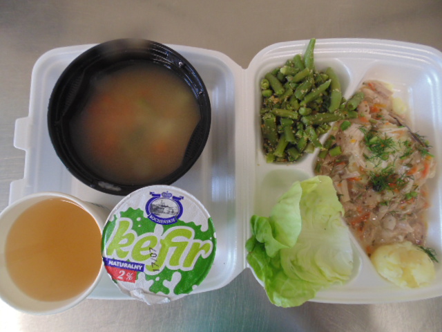 | Chleb graham 100g (gluten), margaryna śniadaniowa 15g (mleko), żurek z jajkiem i kiełbasą 400ml : kości 10g, jajko 1 szt, kiełbasa toruńska 50g (soja), słonina, mąka pszenna20g (gluten), śmietana 10g (mleko), przyprawy (seler), marchew 50g, herbata 200ml, woda niegazowana 0,5l. | Chleb graham 50g (gluten), margaryna śniadaniowa 5g, twaróg 40g (mleko), sałata lodowa | Zupa ziemniaczana : ziemniaki 250g, marchew 30g, seler 20g, pietruszka 20g, śmietana 20g (mleko), wywar kostny, przyprawy (seler), pulpeciki w sosie pomidorowym: biodrówka 50g, wołowina b/k 50g, cebula 30g, pieczywo pszenne 20g (gluten), jajka 1/8, mąka pszenna 15g (gluten), koncentrat pomidorowy 15g, olej 15g, mąka ziemniaczana 5g, przyprawy (seler), ryż 80g, fasolka na parze :fasolka szparagowa 150g, masło ekstra ( mleko), bułka tarta 5g (gluten), kompot z owoców mieszanych 200 ml. |