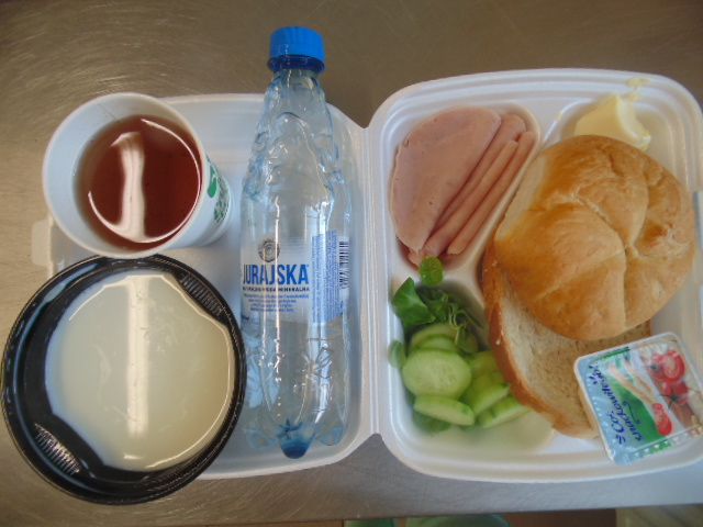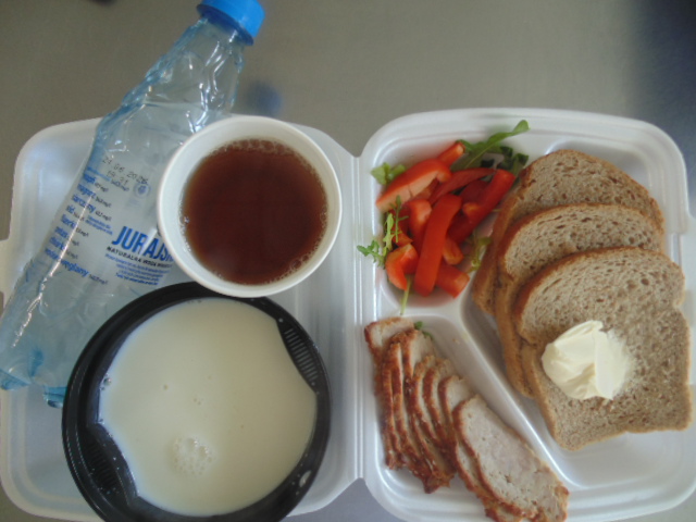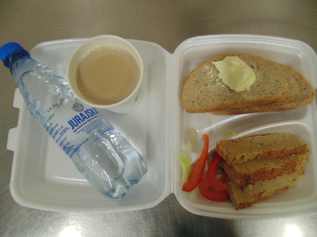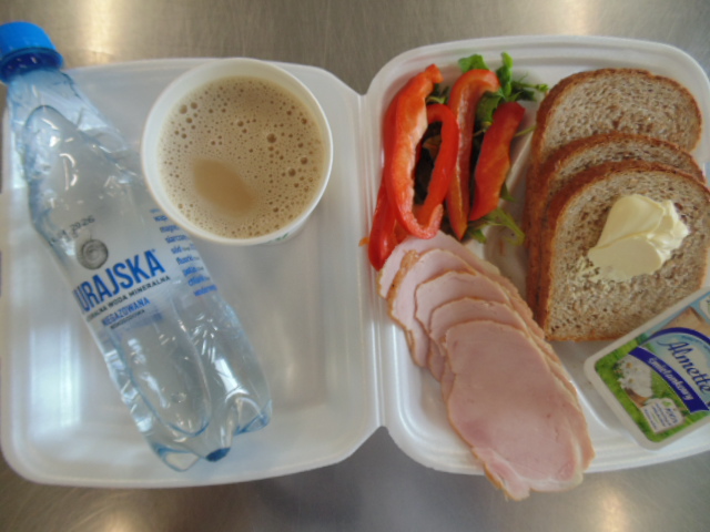 | Chleb graham 50g (gluten), margaryna śniadaniowa 5g(mleko), polędwica sopocka 30g, sałata zielona | Chleb graham 100g (gluten), margaryna śniadaniowa 15g (mleko), twarożek 80g (mleko), pomidor 50g, herbata 200ml. | Sałatka z kasza gryczaną: kasza gryczana 20g, bukiet warzyw 40g, olej, rukola, przyprawy |