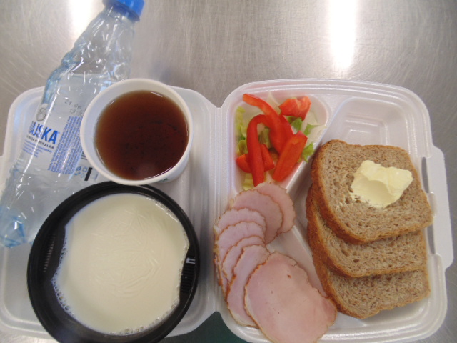 | Chleb graham 50g (gluten), szynka gotowana 30g (soja, mleko), margaryna śniadaniowa 5g (mleko) | Chleb graham 100g (gluten), margaryna śniadaniowa 15g (mleko), jajko w sosie wiosennym: jajko 1szt., jogurt naturalny (mleko) 20g, pomidor 30g, ogórek 30g, szczypiorek, sałata lodowa, herbata 200ml. | serek homogenizowany naturalny 150g (mleko). |