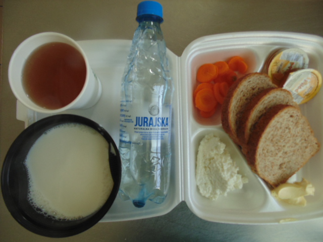 | Chleb graham 50g (gluten), margaryna śniadaniowa 5g (mleko), jajko 1/2szt., sałata lodowa | Chleb graham 100g (gluten), margaryna śniadaniowa 15g (mleko), twaróg 80g (mleko), pomidor 50g, herbata 200ml. | Sałatka z kaszą jęczmienną: kasza jęczmienna 20g (gluten), brokuł 30g, fasolka szparagowa 30g, olej, marchew 30g, przyprawy |