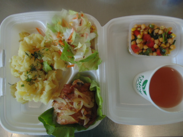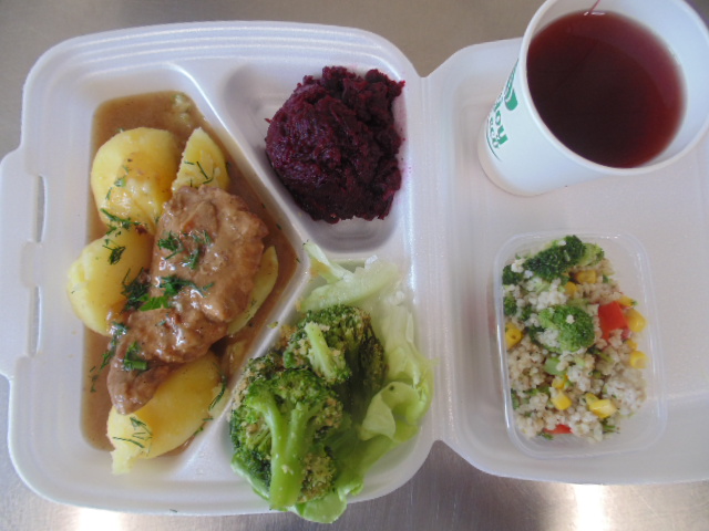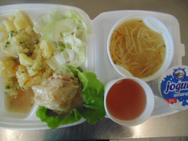 | Chleb graham 100 g (gluten), margaryna śniadaniowa 15g (mleko), klops drobiowy(gulasz z indyka 70g,pieczywo pszenne20g, (gluten), jajko 1/8 szt, maka ziemniaczana, przyprawy (seler)), papryka 50g, rukola, płatki owsiane na mleku 400ml (mleko, gluten), herbata 200ml | Chleb graham 50g (gluten), margaryna śniadaniowa 5g (mleko), szynka gotowana 30g (soja, mleko), pomidor | Rosół z makaronem: makaron 30g (gluten, jajko), marchew 30g, pietruszka 20g, seler 20g, wywar kostny drobiowy, przyprawy (seler), udziec drobiowy w sosie: udziec drobiowy 200g, olej, marchew 30g, pietruszka 20g, seler 20g, śmietana 5g (mleko), mąka pszenna 15g (gluten), przyprawy (seler), ziemniaki 350 g, sałata lodowa, śmietana (mleko) 20g, jogurt naturalny (mleko) 20g, kompot z jabłek 200ml., |