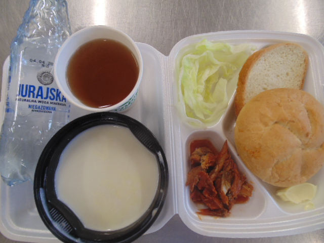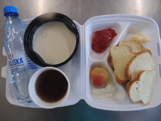 | Rogal 100g (gluten), masło 10g (mleko), dżem truskawkowy niskosłodzony 50g, twaróg 40g (mleko), marchew 50g, herbata 200ml, zupa mleczna z kaszą manną 400ml (mleko, gluten). | Ryba panierowana: ryba 100g, bułka tarta 20g (gluten), 20g olej, mleko 5g, mąka pszenna 10g (gluten), jajka 1/5 szt., ziemniaki 350g, surówka z kapusty kiszonej: kapusta kiszona 150g, cebula 30g, marchew 30g, jabłko 30g, olej 5g, przyprawy (seler), kompot z owoców mieszanych 200ml., mus owocowy 1szt. | Chleb graham 100g (gluten), margaryna śniadaniowa 15g (mleko), pasta z jaj: jajko 1,5 szt, majonez 20 g (gorczyca, jajko), chleb pszenny 10g (gluten), musztarda (gorczyca), przyprawy, pomidor 50g, szczypiorek, herbata 200ml. |