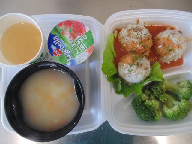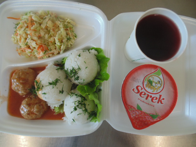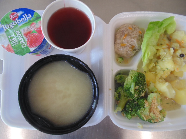 | Pieczywo pszenne 100g (gluten), margaryna śniadaniowa 15g (mleko), żurek z jajkiem i kiełbasą 400 ml: kości 10g, jajko 1 szt, kiełbasa toruńska 50g (soja), słonina , mąka pszenna 20g (gluten), śmietana 10g, przyprawy (seler), marchew 50g, herbata 200ml, woda niegazowana 0,5l. | Pulpeciki w sosie pomidorowym: biodrówka 50g, wołowina b/k 50g, cebula 30g, pieczywo pszenne 20g (gluten), jajka 1/8, mąka pszenna 15g (gluten), konc. pomidorowy 15g, olej 15g, mąka ziemniaczana 5g, przyprawy (seler), ryż 80g, surówka z kapusty białej : kapusta biała 150g, marchew 30g, cebula 30g, jabłko 30g, majonez 20g (gorczyca, jajko), przyprawy (gorczyca), kompot z owoców mieszanych 200 ml. | Chleb graham 100g (gluten) margaryna śniadaniowa 15g (mleko), baleron 60g (soja), sałata zielona, papryka 50g, kawa zbożowa z mlekiem 200 ml (mleko, gluten). |