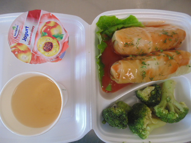 | Chleb pszenny 30g (gluten), kajzerka (gluten) margaryna śniadaniowa 15g (mleko), polędwica z indyka 60g (soja, gluten, gorczyca), ogórek 50g, roszponka, zupa mleczna z płatkami owsianymi 400ml (mleko, gluten), herbata 200ml, woda niegazowana 0,5l | Gołąbki w sosie pomidorowym : kapusta biała 350g, ryż 80g, biodrówka 50g, wołowina 50g, koncentrat pomidorowy 30g, mąka pszenna 30g (gluten), słonina, cebula 30g, śmietana 5g (mleko), olej, przyprawy (seler), brokuł na parze : brokuł 150g, kompot z jabłek 200ml. | Chleb graham 100g (gluten), margaryna śniadaniowa 15g (mleko), ser żółty 60g (mleko), sałata lodowa, herbata 200ml. |