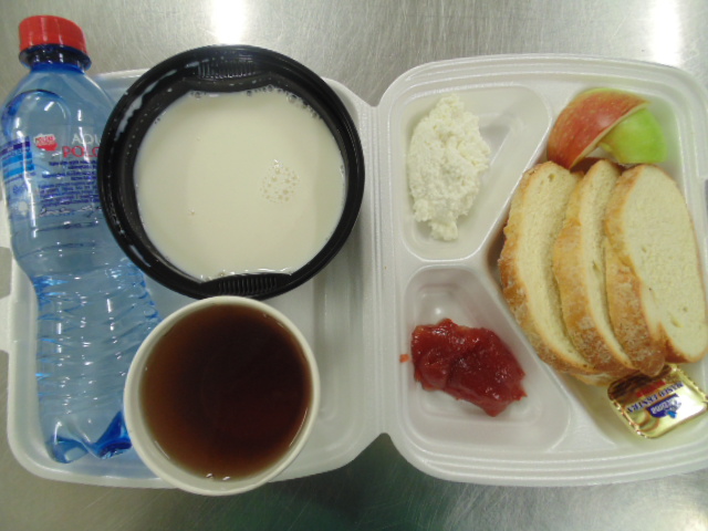 Chleb graham 50g (gluten), margaryna śniadaniowa 5g(mleko), polędwica sopocka 30g, sałata zielonaChleb graham 100g (gluten), margaryna śniadaniowa 15g (mleko), twarożek 80g (mleko), pomidor 50g, herbata 200ml.Sałatka z kaszą gryczaną: kasza gryczana 20g, bukiet warzyw 40g, olej, roszponka, przyprawy.