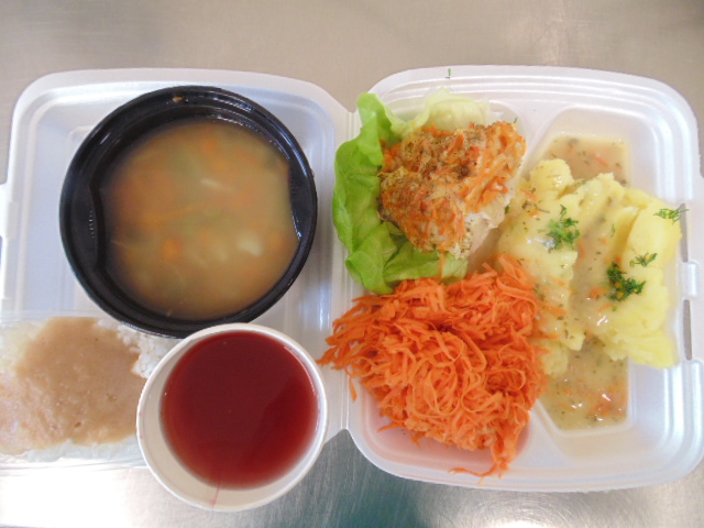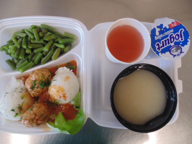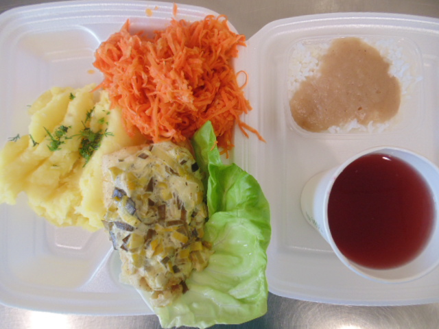 Chleb graham 50g (gluten), margaryna śniadaniowa 5g (mleko), pomidor 50g.Chleb graham 100g (gluten), margaryna śniadaniowa 15g (mleko), sałatka jarzynowa: marchew 100g, ziemniaki 30g, pietruszka 40g, seler 30g,jabłko 30g , groszek konserwowy, majonez 20g (jaja, gorczyca), jajko , jogurt naturalny 10g (mleko) przyprawy, herbata 200ml.Ryż z jabłkami (jabłka, ryż, cynamon).