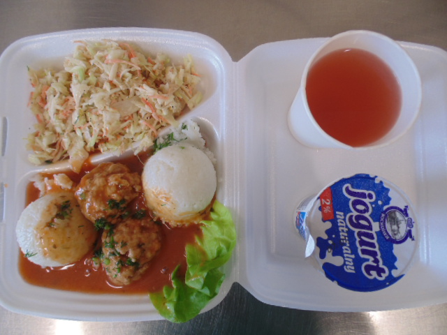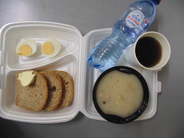 Chleb graham 100g (gluten), margaryna śniadaniowa 15g (mleko), żurek z jajkiem i kiełbasą 400 ml: kości 10g, jajko 1 szt, kiełbasa toruńska 50g (soja), słonina , mąka pszenna 20g (gluten), śmietana 10g (mleko), przyprawy (seler), marchew 50g, herbata 200ml, woda niegazowana 0,5l.Pulpeciki w sosie pomidorowym: biodrówka 50g, wołowina b/k 50g, cebula 30g, pieczywo pszenne 20g (gluten), jajka 1/8, mąka pszenna 15g (gluten), konc. pomidorowy 15g, olej 15g, mąka ziemniaczana 5g, przyprawy (seler), ryż 80g, surówka z kapusty białej: kapusta biała 150g, marchew 30g, cebula 30g, jabłko 30g, majonez 20g (gorczyca, jajko), przyprawy (gorczyca), kompot z owoców mieszanych 200 ml.Chleb pszenny 100g (gluten) margaryna śniadaniowa 15g (mleko), baleron 60g (soja, gluten), sałata zielona, papryka 50g, kawa zbożowa z mlekiem 200 ml (mleko, gluten).