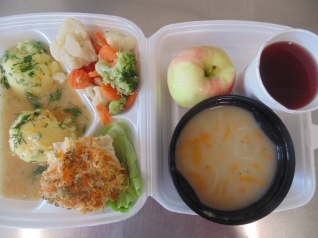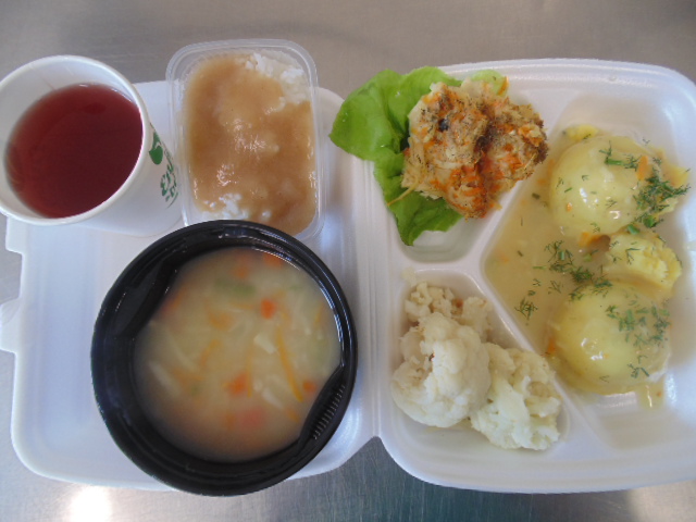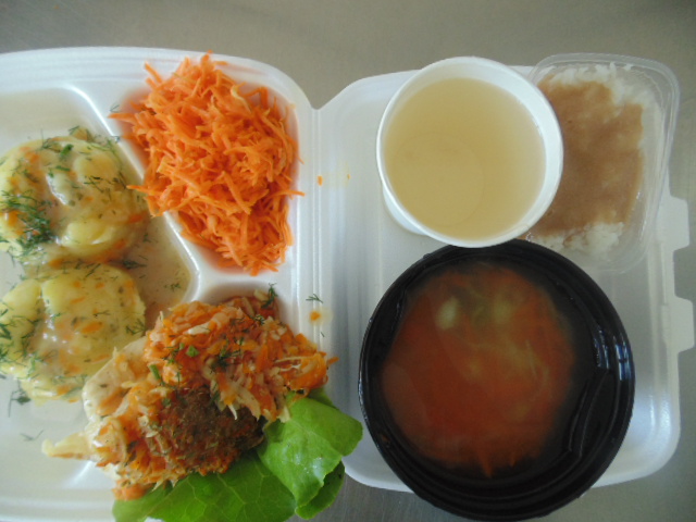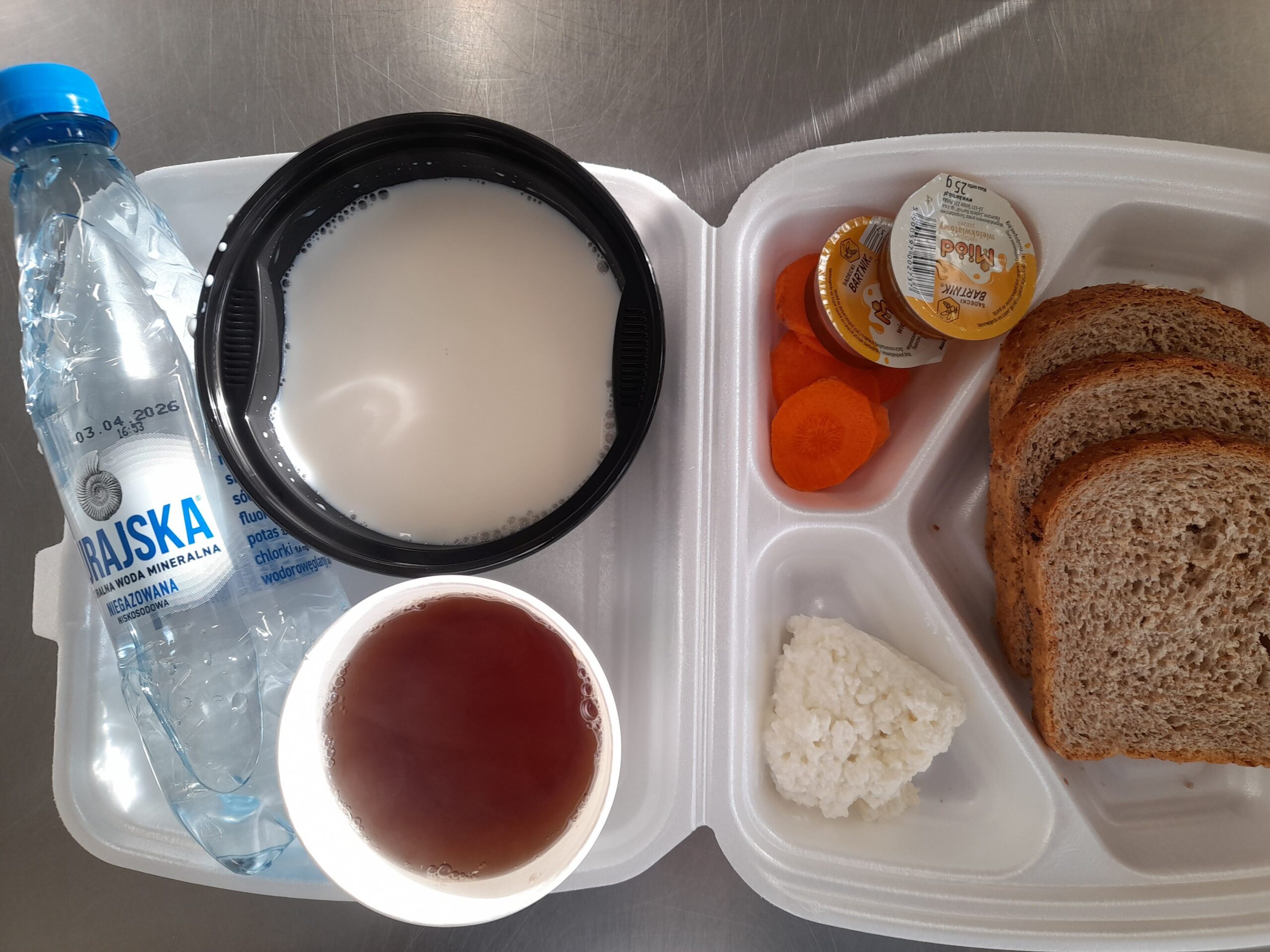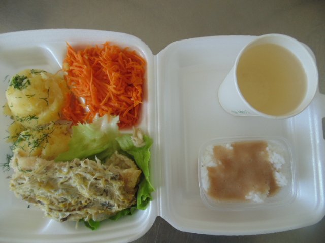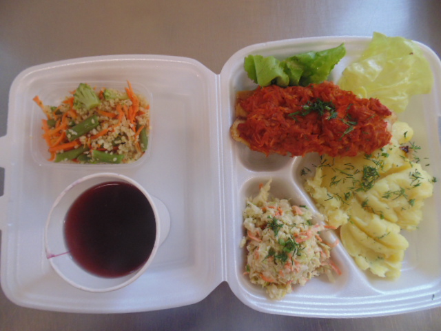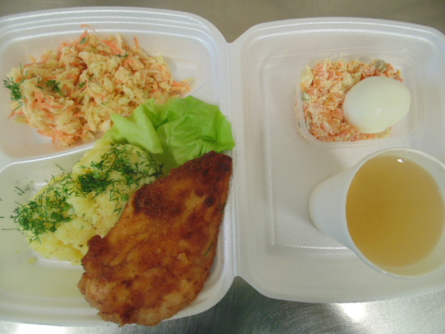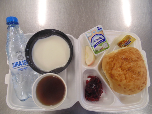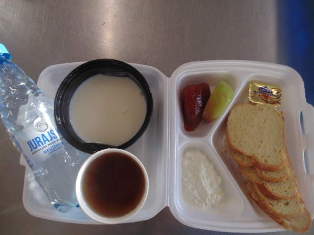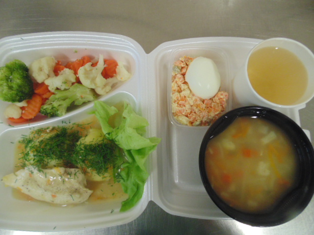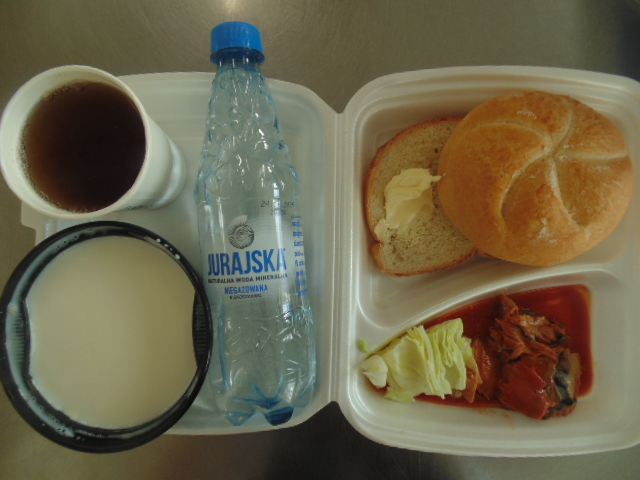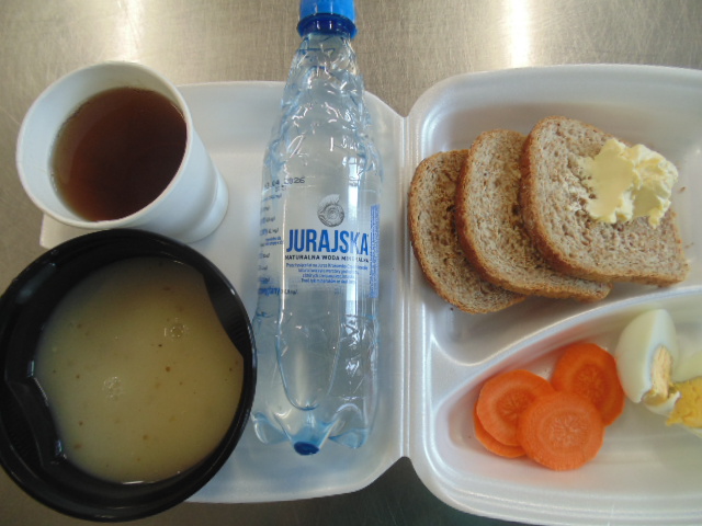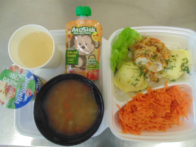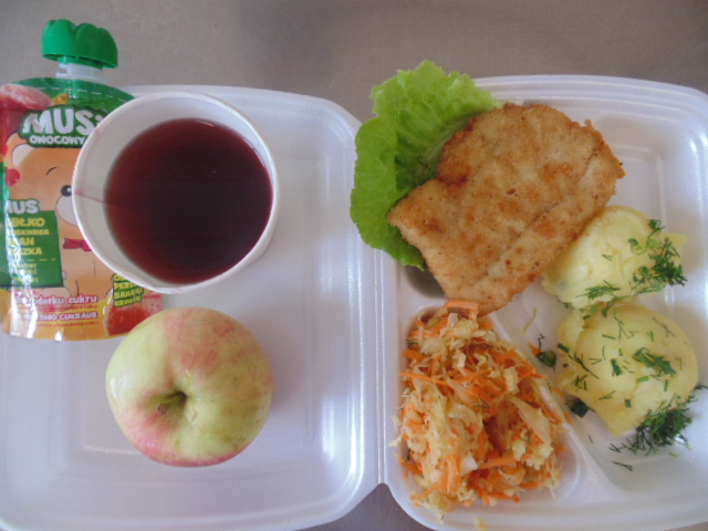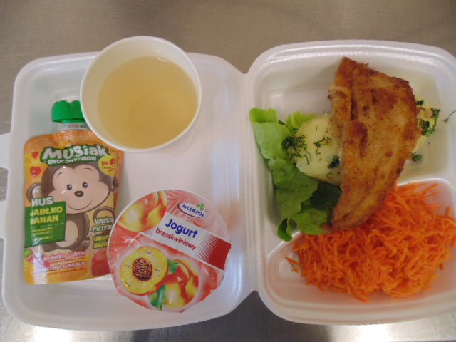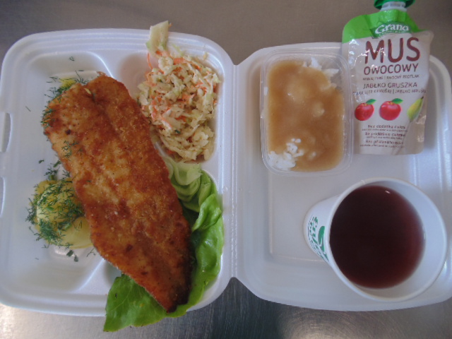 | Rogal 100g (gluten, jaja, mleko), margaryna śniadaniowa 15g (mleko), dżem niskosłodzony 50g, twaróg 40g (mleko), marchew 50g, herbata 200ml, zupa mleczna z kaszą manną 400ml (mleko, gluten) | Ryba panierowana: ryba 100g, bułka tarta 20g (gluten), 20g olej, mleko 5g, mąka pszenna 10g (gluten), jajka 1/5 szt., ziemniaki 350g, surówka z kapusty kiszonej: kapusta kiszona 150g, cebula 30g, marchew 30g, jabłko 30g, olej 5g, przyprawy (seler), kompot z owoców mieszanych 200ml., mus owocowy 1szt. | Chleb graham 100g (gluten), margaryna śniadaniowa 15g (mleko), pasta z jaj: jajko 1,5 szt, majonez 20 g (gorczyca, jajko), chleb pszenny 10g (gluten), musztarda (gorczyca), przyprawy, pomidor 50g, szczypiorek, herbata 200ml. |