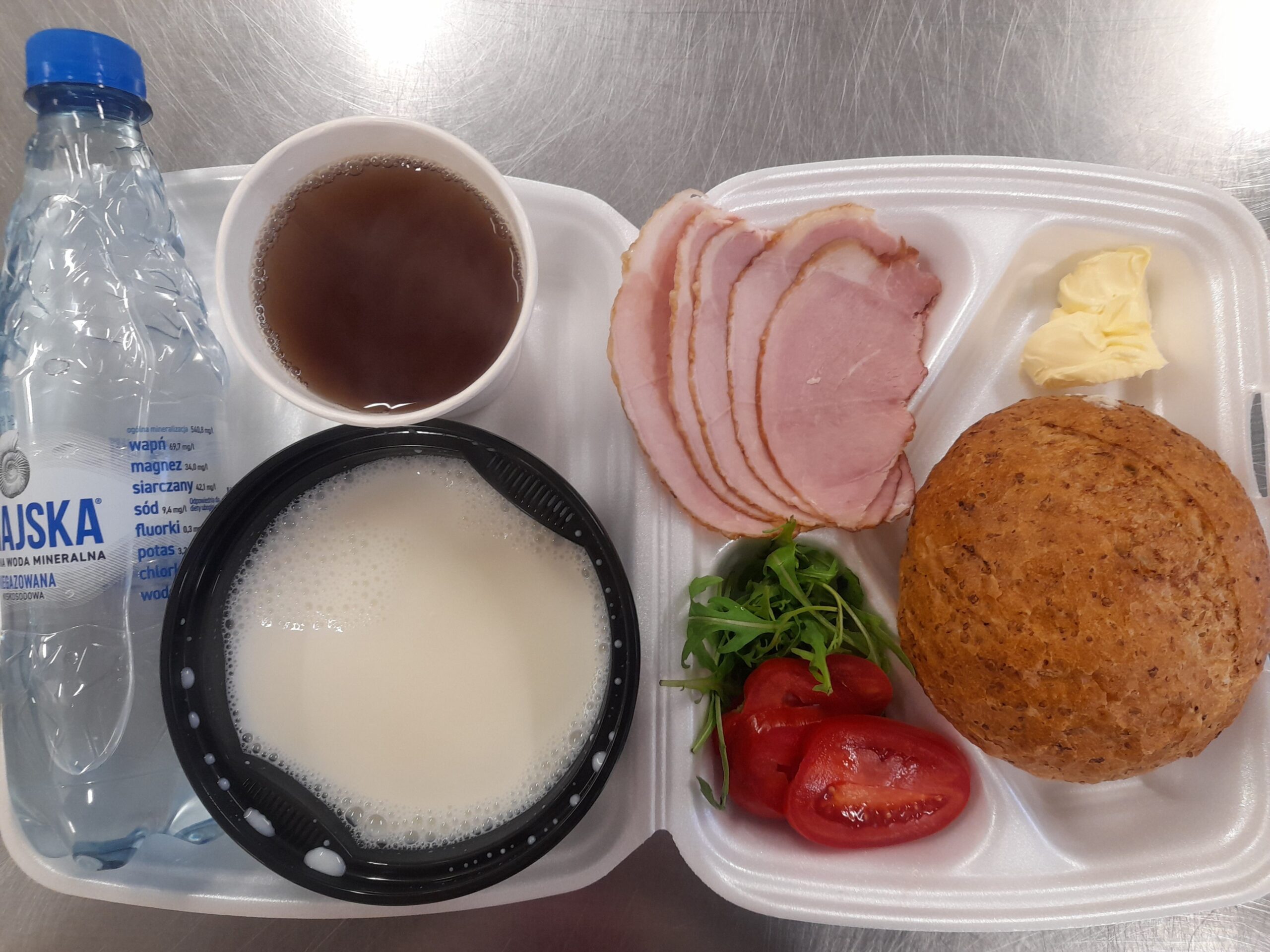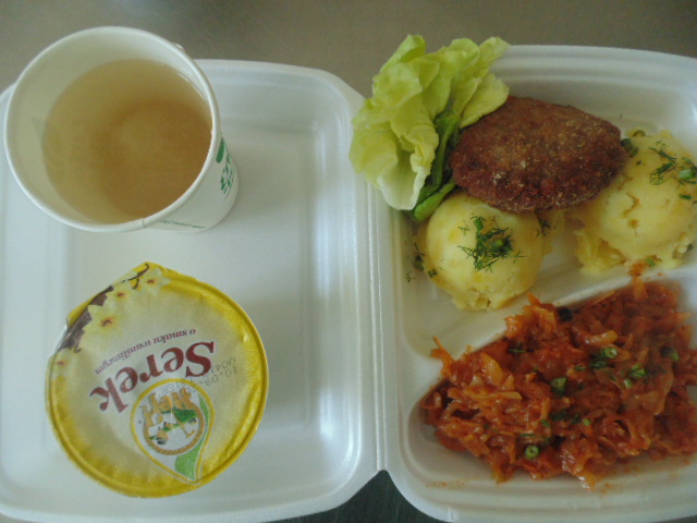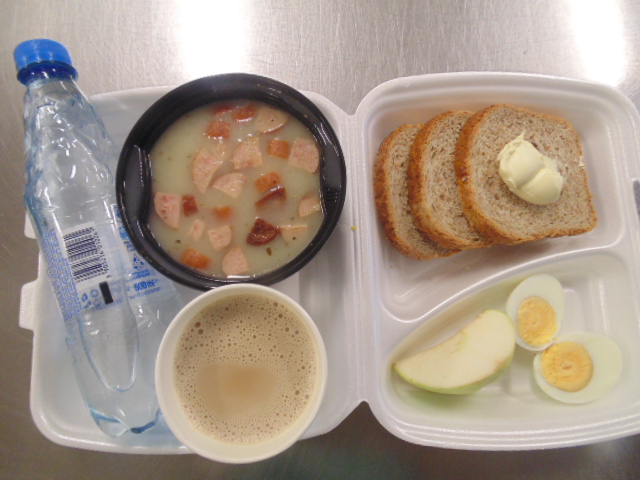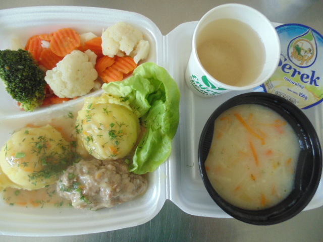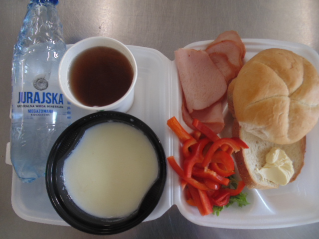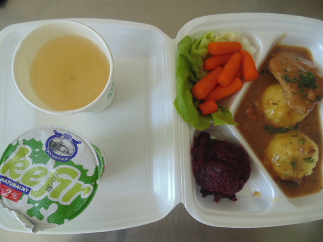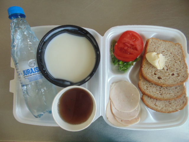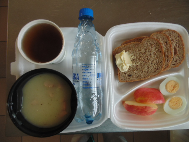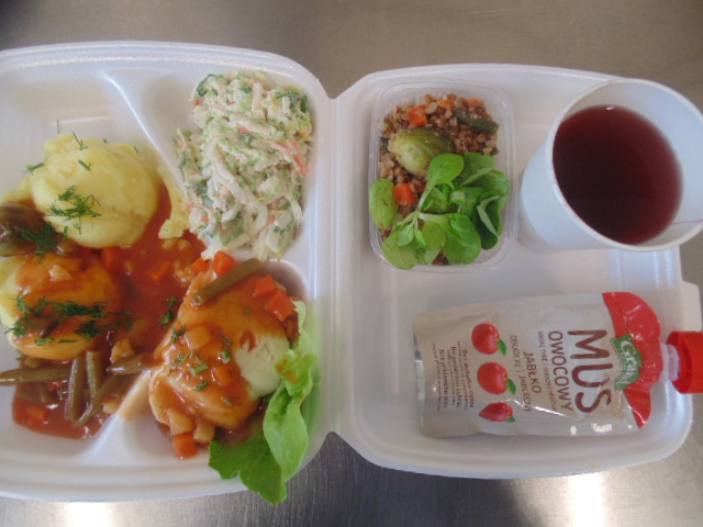 | Pieczywo pszenne 50g (gluten), bułka kajzerka 50g (gluten), margaryna śniadaniowa 15g (mleko), szynka wiejska 60g, ogórek zielony 50g, roszponka, mozarella (mleko), herbata 200ml, woda niegazowana 0,5l | Filet drobiowy soute: filet drobiowy 100g, cebula 30g, mąka pszenna 15g (gluten), śmietana 5g (mleko), olej 15g, przyprawy (seler), ziemniaki 350g, surówka z kapusty włoskiej (150g kapusta włoska, 30g marchew, 30g cebula, 30g jabłko, 20g pomidor, majonez (gorczyca, jajko), przyprawy: sól, cukier, pieprz, musztarda (gorczyca)), kompot z jabłek 200ml. | Chleb graham 100g (gluten), margaryna śniadaniowa 15g (mleko), krupnik z mięsem: ziemniaki 100g, kasza jęczmienna 30g (gluten), biodrówka 30g, marchew 30g, pietruszka 20g, seler 20g, śmietana 5g (mleko), kości 10g, przyprawy (seler), herbata 200ml. |