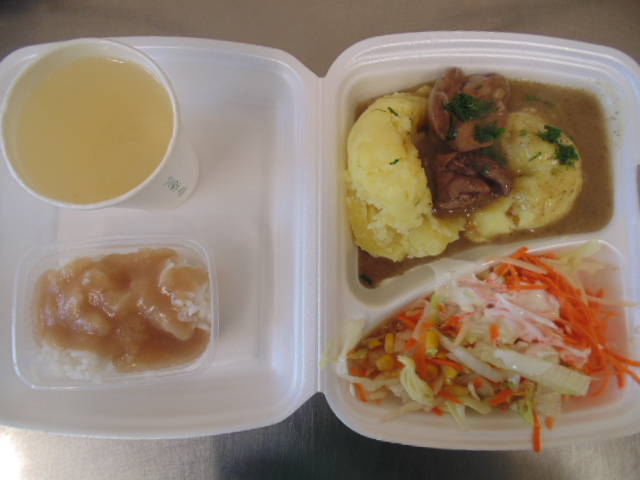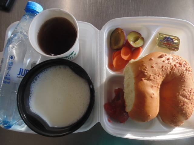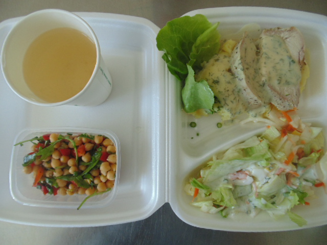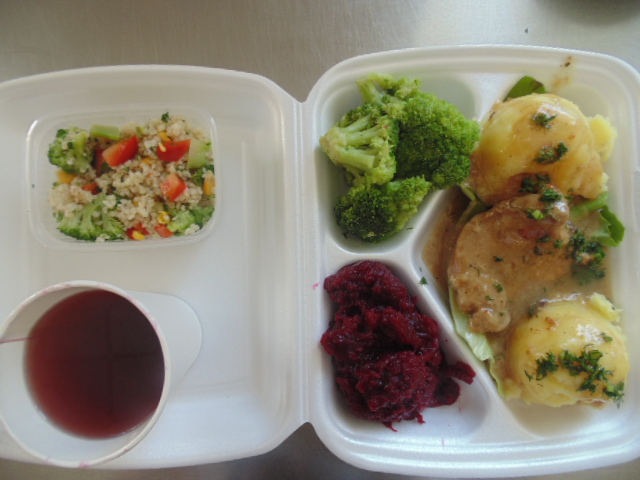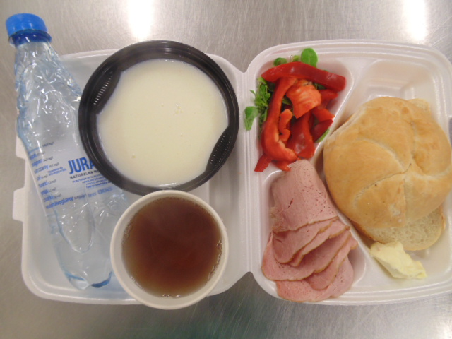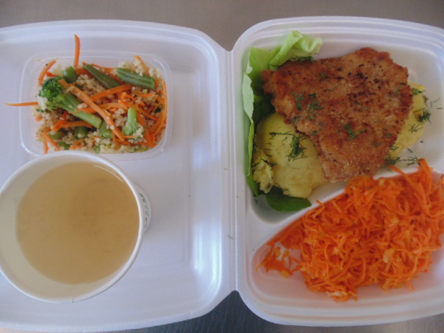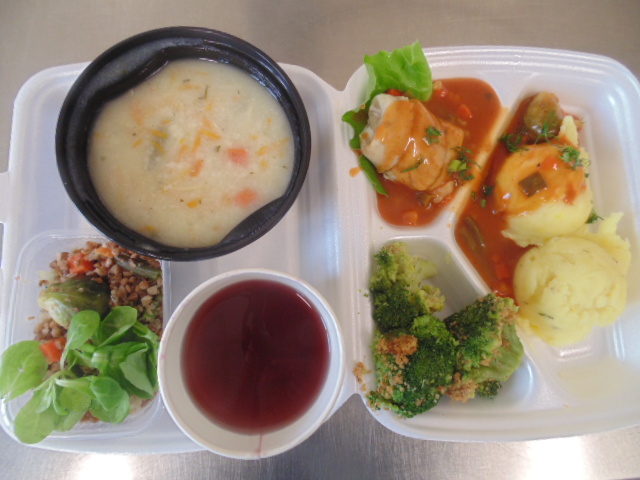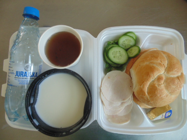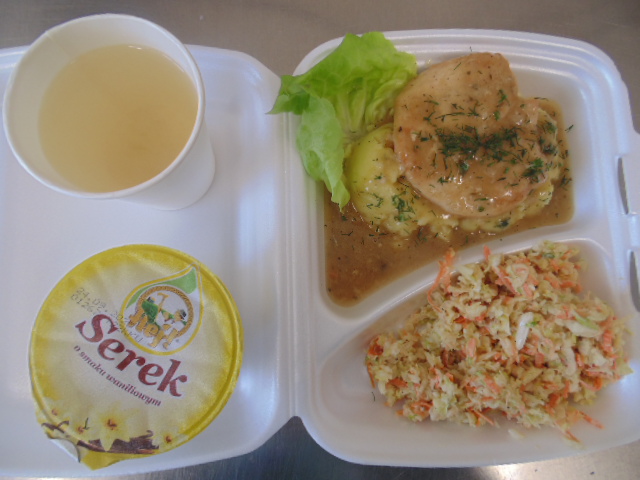 | Pieczywo pszenne 50g (gluten), bułka kajzerka 50g (gluten), margaryna śniadaniowa 15g (mleko), szynka wiejska 60g, ogórek zielony 50g, roszponka, mozarella (mleko), herbata 200ml, woda niegazowana 0,5l | Filet drobiowy soute: filet drobiowy 100g, cebula 30g, mąka pszenna 15g (gluten), śmietana 5g (mleko), olej 15g, przyprawy (seler), ziemniaki 350g, surówka z kapusty włoskiej (150g kapusta włoska, 30g marchew, 30g cebula, 30g jabłko, 20g pomidor, majonez (gorczyca, jajko), przyprawy: sól, cukier, pieprz, musztarda (gorczyca)), kompot z jabłek 200ml. | Chleb graham 100g (gluten), margaryna śniadaniowa 15g (mleko), krupnik z mięsem: ziemniaki 100g, kasza jęczmienna 30g (gluten), biodrówka 30g, marchew 30g, pietruszka 20g, seler 20g, śmietana 5g (mleko), kości 10g, przyprawy (seler), herbata 200ml. |