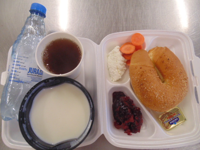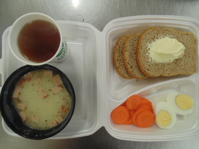 | Chleb graham 50g (gluten), margaryna śniadaniowa 5g (mleko), twaróg 40g (mleko), sałata zielona | Chleb graham 100g (gluten), margaryna śniadaniowa 15g (mleko), galaretka drobiowa: udziec z kurczaka 100g, marchew 20g, pietruszka 10g, seler 10g, żelatyna spożywcza 5g, przyprawy, kawa zbożowa z mlekiem 200 ml (mleko, gluten) | Sałatka z kaszą jęczmienną: kasza jęczmienna (gluten) 20g, marchewka 30g, brokuł 30g, fasolka szparagowa 30g, olej |