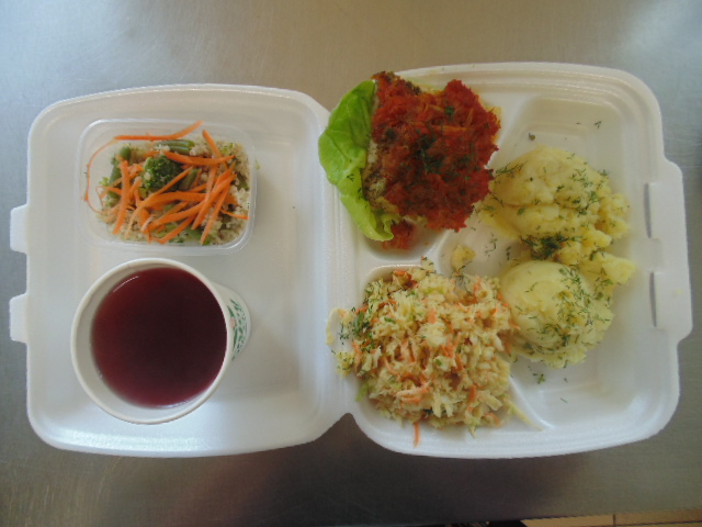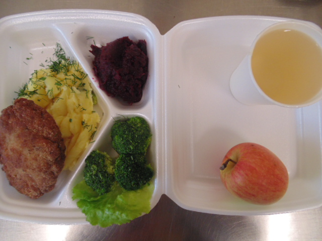 | Bułka grahamka(gluten), serek topiony(mleko), kiełbasa krakowska (soja) 60g, ogórek zielony 50g, rukola, zupa mleczna z ryżem 400 ml (mleko), herbata 200 ml, woda niegazowana 0,5l | Kotlet mielony: biodrówka 50g, wołowina 50g, cebula 30g, pieczywo pszenne 20g (gluten), jajka 1/5 szt., mąka pszenna 10g (gluten), mąka ziemniaczana 5g, olej 20g, ziemniaki 350g, ćwikła: buraki czerwone 180g, chrzan 5g (mleko), brokuł na parze (brokuł 100g), przyprawy (seler), kompot z jabłek 200ml. | Pieczywo pszenne 100g (gluten), margaryna śniadaniowa 15g (mleko), pasta z jajek: jajka 1 i ½ szt., majonez 20g (gorczyca, jajko), pieczywo pszenne 10g (gluten), musztarda (gorczyca), szczypiorek,sałata lodowa, herbata 200ml. |