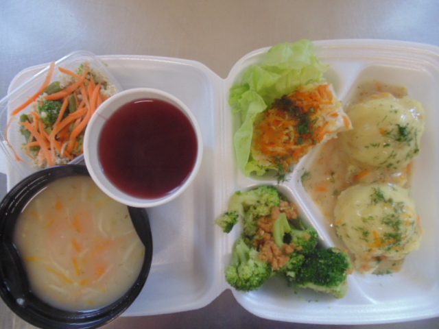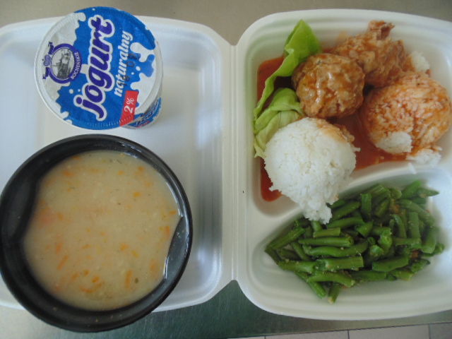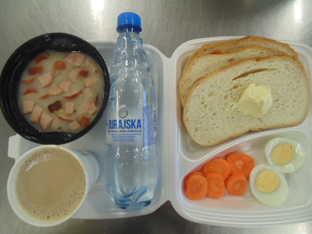 | Pieczywo pszenne 100g (gluten), margaryna śniadaniowa 15g (mleko), żurek z jajkiem i kiełbasą 400 ml: kości 10g, jajko 1 szt, kiełbasa toruńska 50g (soja), słonina , mąka pszenna 20g (gluten), śmietana 10g, przyprawy (seler), marchew 50g, herbata 200ml, woda niegazowana 0,5l. | Pulpeciki w sosie pomidorowym: biodrówka 50g, wołowina b/k 50g, cebula 30g, pieczywo pszenne 20g (gluten), jajka 1/8, mąka pszenna 15g (gluten), konc. pomidorowy 15g, olej 15g, mąka ziemniaczana 5g, przyprawy (seler), ryż 80g, surówka z kapusty białej : kapusta biała 150g, marchew 30g, cebula 30g, jabłko 30g, majonez 20g (gorczyca, jajko), przyprawy (gorczyca), kompot z owoców mieszanych 200 ml. | Chleb graham 100g (gluten) margaryna śniadaniowa 15g (mleko), baleron 60g (soja), sałata zielona, papryka 50g, kawa zbożowa z mlekiem 200 ml (mleko, gluten). |