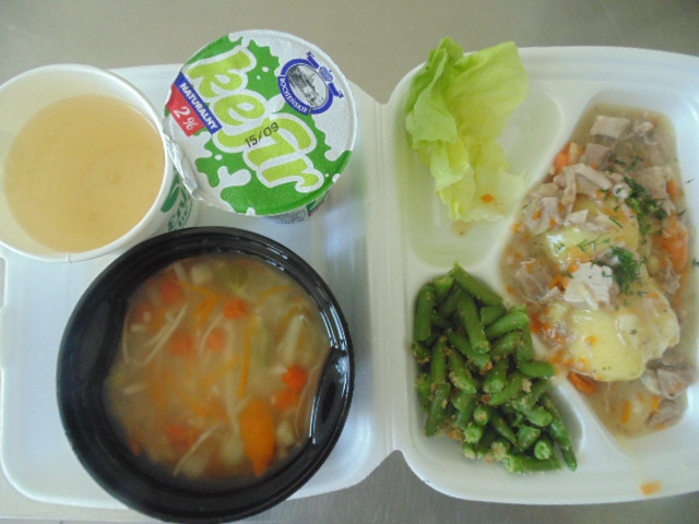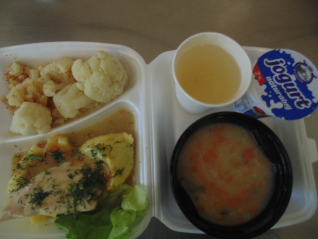 | Chleb graham 50g(gluten), margaryna śniadaniowa 5g (mleko), szynka gotowana 30g (soja, mleko), pomidor | Chleb graham 100g (gluten), margaryna śniadaniowa 15g (mleko), krupnik z mięsem: ziemniaki 100g, kasza jęczmienna 30g (gluten), biodrówka 30g, marchew 30g, pietruszka 20g, seler 20g, śmietana 5g (mleko), kości 10g, przyprawy (seler), herbata 200ml. | Jogurt naturalny 150g (mleko) |