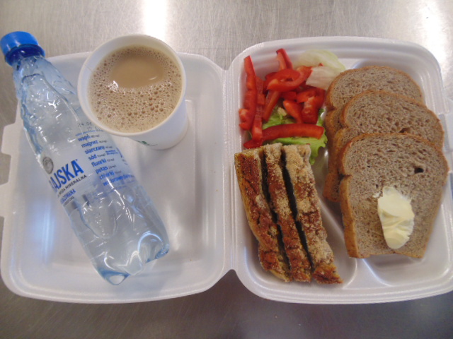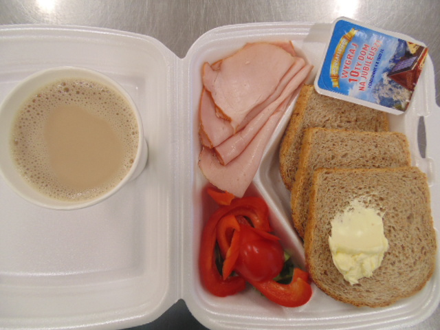 | Chleb graham 50g (gluten), margaryna śniadaniowa 5g(mleko), polędwica sopocka 30g, sałata zielona | Chleb graham 100g (gluten), margaryna śniadaniowa 15g (mleko), twarożek 80g (mleko), pomidor 50g, herbata 200ml. | Sałatka z kaszą gryczaną: kasza gryczana 20g, bukiet warzyw 40g, olej, rukola, przyprawy. |