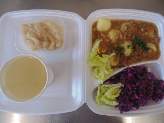 | Chleb graham100g (gluten), margaryna śniadaniowa 15g (mleko), pasztet z soczewicy: soczewica 40g, marchew 20g, pietruszka 15g, cebula 10g, ryż 15g, jajko 1/6 szt, mąka ziemniaczana 6g, bułka tarta 5g (gluten), olej, papryka 50g, sałata zielona, przyprawy, kawa zbożowa z mlekiem 200 ml (gluten, mleko) | Kluski śląskie z sosem mięsno- jarzynowym: ziemniaki 350g, mąka ziemniaczana 50g, olej 5g, słonina 10g , jajko 1/5szt , biodrówka 50g, wołowina b/k 50g, mąka pszenna 15g (gluten), cebula 30g, marchew 30g, pietruszka 20g, seler 20g, olej 5g, ogórek konserwowy 10g, groszek konserwowy 10g, śmietana 5g (mleko), przyprawy (seler), surówka z kapusty czerwonej: kapusta czerwona 150g, cebula 30g, jabłko 30g, olej 5g, przyprawy, kompot z jabłek 200ml. | Pieczywo pszenne 100g (gluten), margaryna śniadaniowa 15g (mleko), zupa ziemniaczana z mięsem: ziemniaki 250g, biodrówka 30g, marchew 30g, pietruszka 20g, seler 20g, śmietana 10g (mleko), kości 10g, przyprawy (seler), herbata 200ml. |