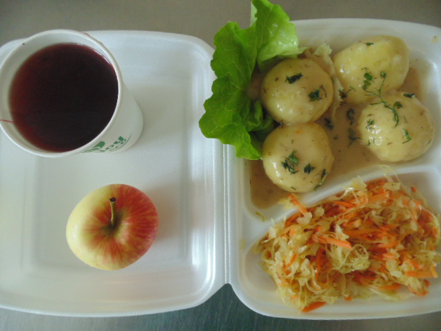 | Pieczywo pszenne 100g (gluten), margaryna śniadaniowa 15g (mleko), żurek z jajkiem i kiełbasą: kości, jajko 1szt, kiełbasa toruńska 50g (soja), słonina 10g, mąka pszenna 20g (gluten), śmietana 10g (mleko), czosnek, przyprawy (seler), jabłko, herbata 200ml, | Pyzy z mięsem: ziemniaki 350g, biodrówka 70g, mąka pszenna 40g (gluten), mąka ziemniaczana 50g, jajka 1/5 szt, cebula 30g, słonina 10g, olej 10g, sos pieczeniowy (gluten, soja), surówka z kapusty kiszonej: kapusta kiszona 150g, marchew 30g, cebula 30g, jabłko 30g, olej 5g, przyprawy (seler), kompot z mieszanki owocowej 200ml. | Chleb graham 100g (gluten), margaryna śniadaniowa 15g (mleko), szynka wiejska 60g, pomidor 50g, sałata zielona, kawa zbożowa z mlekiem (mleko, gluten) 200ml. |