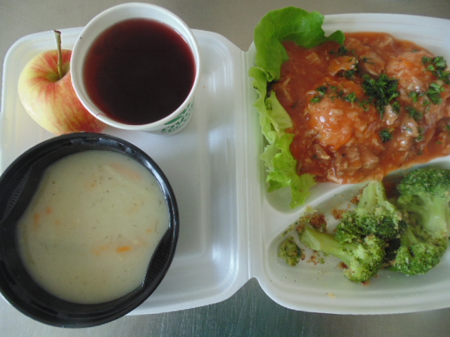 | Chleb graham100g (gluten), margaryna śniadaniowa15g (mleko), polędwica sopocka 60g, pomidor, sałata lodowa, kawa zbożowa z mlekiem 200 ml (gluten, mleko). | Chleb graham 50g (gluten), pasta rybna: twaróg 30g (mleko), konserwa rybna 20g (ryba, gorczyca), margaryna śniadaniowa 5g ( mleko) | Zupa pomidorowa z ryżem: ryż 30g, marchew 30g, pietruszka 20g, seler 20g , konc. pomidorowy 15g, śmietana 10g (mleko), kości, przyprawy (seler) , makaron nitki z sosem mięsno-jarzynowym: makaron 70g (gluten, jajka), biodrówka 50g, wołowina b/k 50g, mąka pszenna 15g (gluten), marchew 30g, pietruszka 20g, seler 20g, olej 5g, śmietana 5g (mleko), przyprawy (seler), brokuł na parze 150g (brokuł mrożony), kompot z jabłek 200ml. |