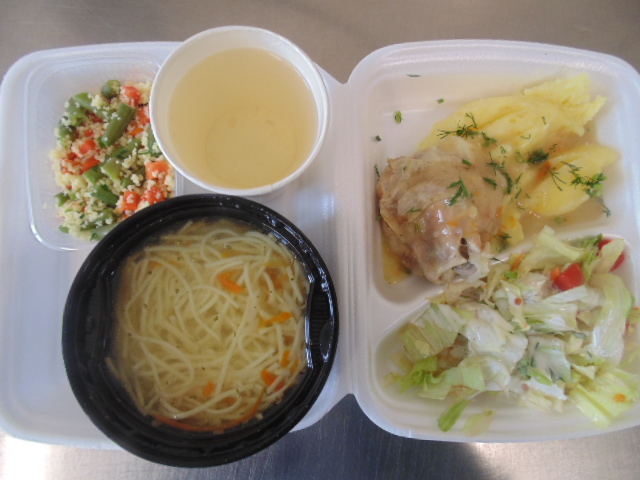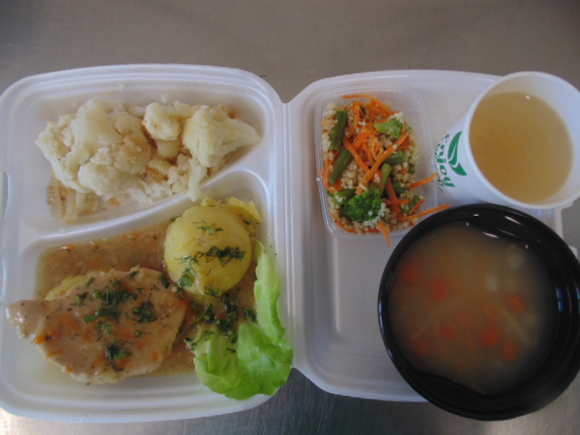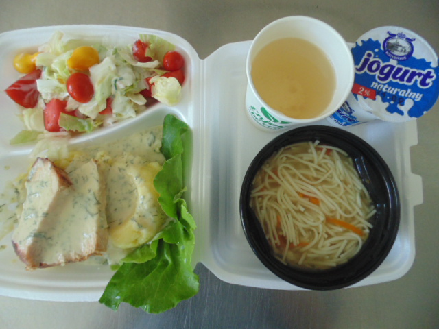 | Chleb graham 100 g (gluten), margaryna śniadaniowa 15g (mleko), klops drobiowy(gulasz z indyka 70g,pieczywo pszenne20g, (gluten), jajko 1/8 szt, maka ziemniaczana, przyprawy (seler)), papryka 50g, rukola, płatki owsiane na mleku 400ml (mleko, gluten), herbata 200ml | Chleb graham 50g (gluten), margaryna śniadaniowa 5g (mleko), szynka gotowana 30g (soja, mleko), pomidor | Rosół z makaronem: makaron 30g (gluten, jajko), marchew 30g, pietruszka 20g, seler 20g, wywar kostny drobiowy, przyprawy (seler), udziec drobiowy w sosie: udziec drobiowy 200g, olej, marchew 30g, pietruszka 20g, seler 20g, śmietana 5g (mleko), mąka pszenna 15g (gluten), przyprawy (seler), ziemniaki 350 g, sałata lodowa, śmietana (mleko) 20g, jogurt naturalny (mleko) 20g, kompot z jabłek 200ml., |