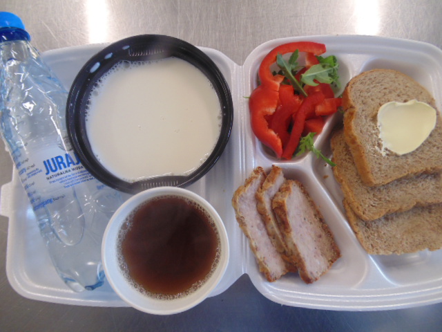 | Chleb pszenny 50g (gluten), bułka kajzerka 50g, margaryna śniadaniowa 15g (mleko), szynka wiejska 60g, papryka, rukola, zupa mleczna z kaszą manną 400ml (mleko, gluten), herbata 200ml, woda niegazowana 0,5l | Karkówka w sosie: karkówka 120g, cebula 30g , olej 15g, śmietana 5g (mleko), mąka pszenna 15g (gluten), przyprawy (seler), ziemniaki 350g, ćwikła: buraki, chrzan (mleko, siarczyny), przyprawy, marchewka na parze ( marchew mrożona 100g), kompot z jabłek 200ml | Chleb graham 100g (gluten), margaryna śniadaniowa 15g (mleko), ser żółty 60g (mleko), ogórek zielony 50g, herbata 200ml. |