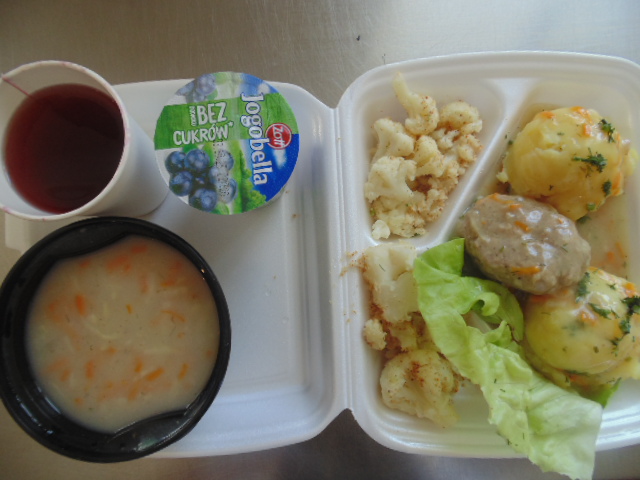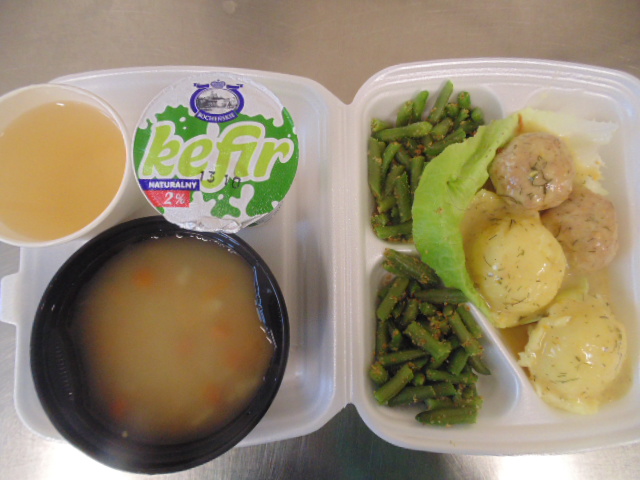 | Chleb graham 100g (gluten), margaryna śniadaniowa 15g (mleko), żurek z jajkiem i kiełbasą 400ml : kości 10g, jajko 1 szt, kiełbasa toruńska 50g (soja), słonina, mąka pszenna20g (gluten), śmietana 10g (mleko), przyprawy (seler), marchew 50g, herbata 200ml, woda niegazowana 0,5l. | Chleb graham 50g (gluten), margaryna śniadaniowa 5g, twaróg 40g (mleko), sałata lodowa | Zupa ziemniaczana: ziemniaki 250g, marchew 30g, seler 20g, pietruszka 20g, śmietana 20g (mleko), wywar kostny, przyprawy (seler), pulpeciki w sosie pomidorowym: biodrówka 50g, wołowina b/k 50g, cebula 30g, pieczywo pszenne 20g (gluten), jajka 1/8, mąka pszenna 15g (gluten), koncentrat pomidorowy 15g, olej 15g, mąka ziemniaczana 5g, przyprawy (seler), ryż 80g, fasolka na parze :fasolka szparagowa 150g, masło ekstra ( mleko), bułka tarta 5g (gluten), kompot z owoców mieszanych 200 ml. |