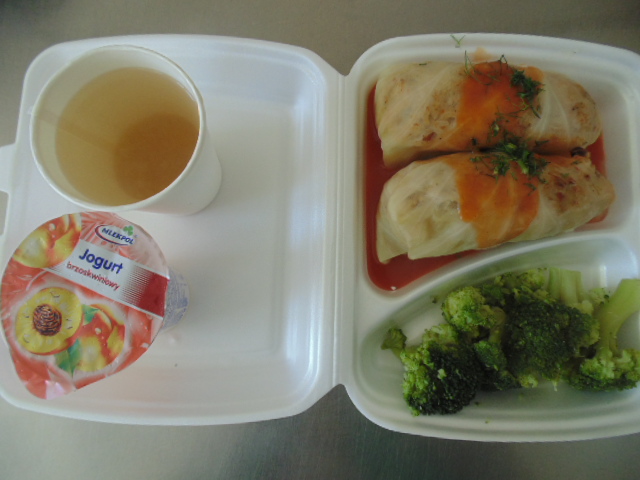 | Chleb pszenny 30g (gluten), kajzerka (gluten) serek topiony (mleko), polędwica z indyka 60g (soja, gluten, gorczyca), ogórek 50g, roszponka, zupa mleczna z płatkami owsianymi 400ml (mleko, gluten), herbata 200ml, woda niegazowana 0,5l | Gołąbki w sosie pomidorowym: kapusta biała 350g, ryż 80g, biodrówka 50g, wołowina 50g, koncentrat pomidorowy 30g, mąka pszenna 30g (gluten), słonina, cebula 30g, śmietana 5g (mleko), olej, przyprawy (seler), brokuł na parze : brokuł 150g, kompot z jabłek 200ml. | Chleb graham 100g (gluten), margaryna śniadaniowa 15g (mleko), ser żółty 60g (mleko), sałata lodowa, herbata 200ml. |