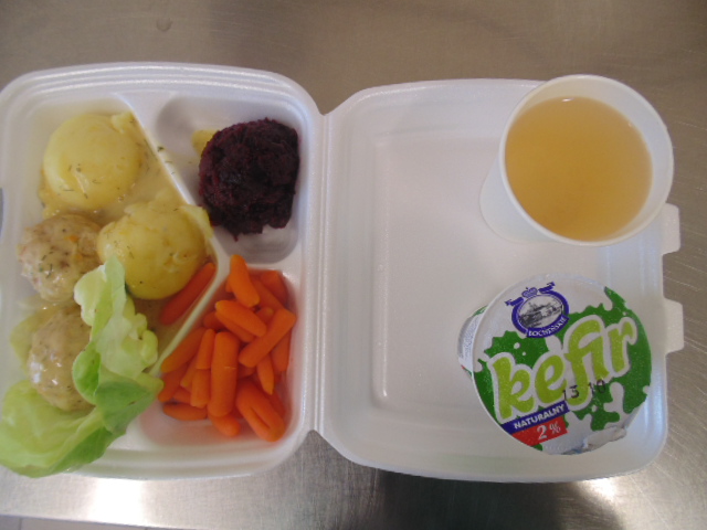| Chleb pszenny 50g (gluten), bułka kajzerka 50g, margaryna śniadaniowa 15g (mleko), szynka wiejska 60g, papryka, rukola, zupa mleczna z kaszą manną 400ml (mleko, gluten), herbata 200ml, woda niegazowana 0,5l | Klopsiki z indyka w sosie koperkowym: filet z indyka 100g, śmietana 15g (mleko), mąka pszenna 5g (gluten), mąka ziemniaczana 5g, koperek, seler 20g, pietruszka 20g, jajko 1/5 szt., przyprawy (seler), ziemniaki 350g, ćwikła: buraki, chrzan (mleko, siarczyny), przyprawy, marchewka na parze ( marchew mrożona 100g), kompot z jabłek 200ml | Chleb graham 100g (gluten), margaryna śniadaniowa 15g (mleko), ser żółty 60g (mleko), ogórek zielony 50g, herbata 200ml. |